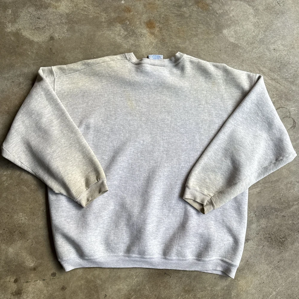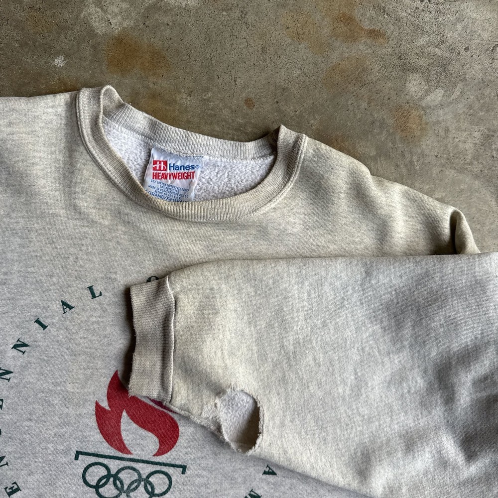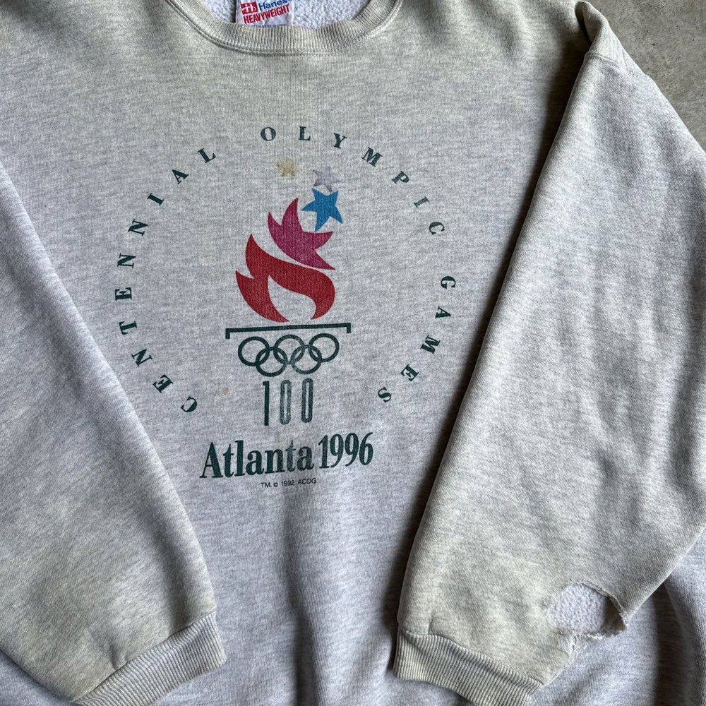 Vintage 1996 Atlanta Centennial Olympic Games sweatshirt in heather gray. This classic crewneck features the iconic 1996 Atlanta Olympics Centennial torch logo prominently on the front. Pre-owned condition with signs of authentic wear, including fading, marks, and tearing around the cuffs, which add to its vintage character. Please refer to photos for exact condition details. Crafted from a comfortable 50% cotton, 50% polyester blend. Made in USA.