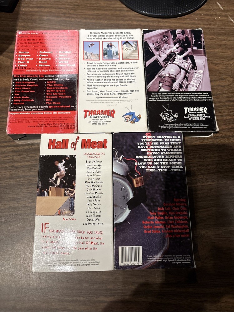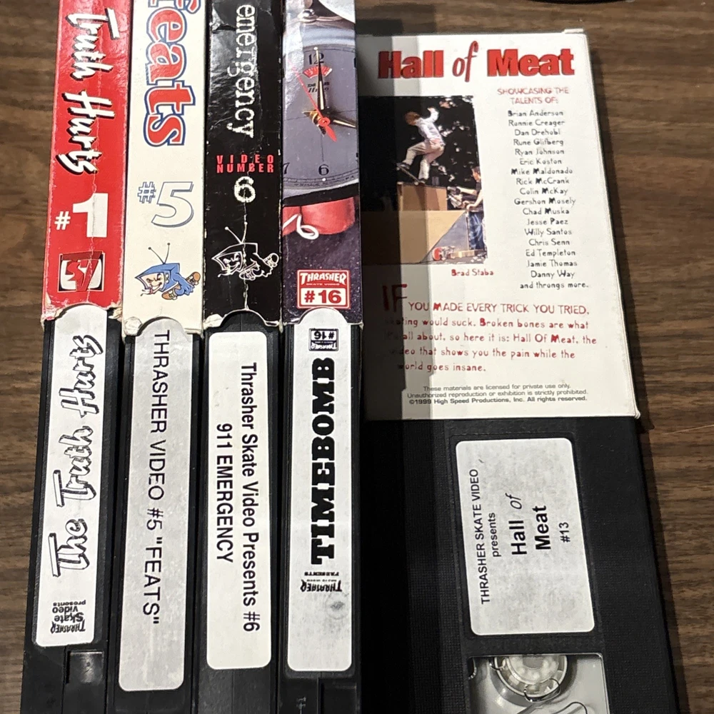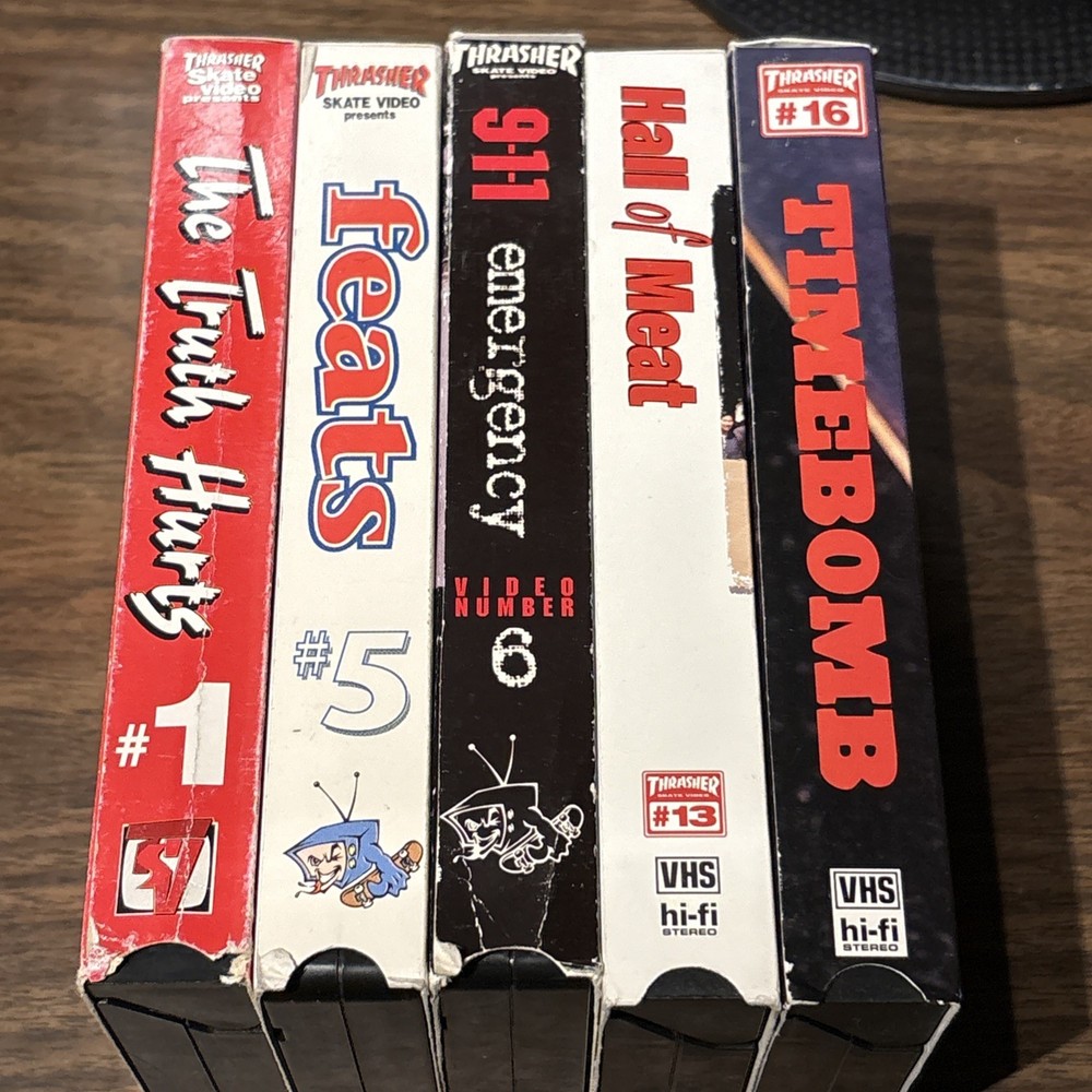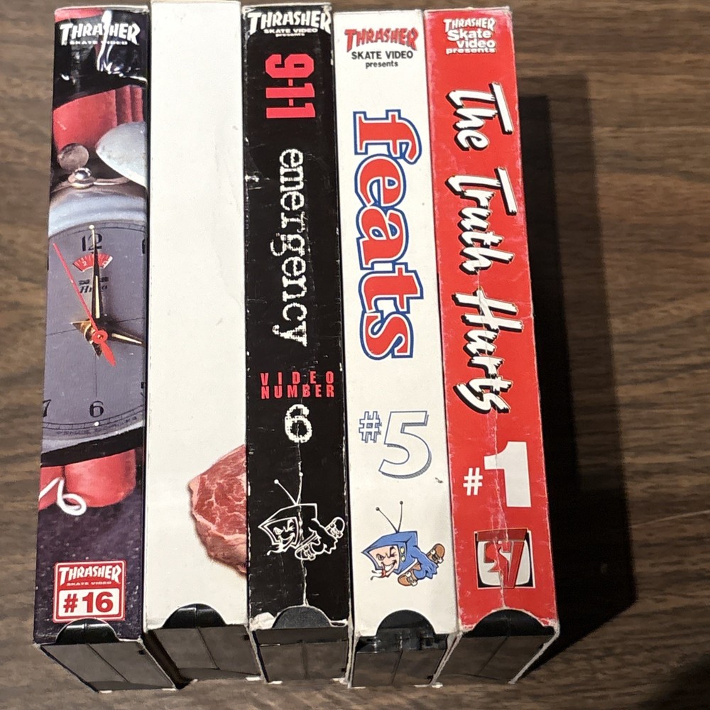 Dive into the gritty world of skateboarding with the Thrasher Magazine Skateboard Video Lot, featuring issues 1-5-6-13-16. This collection is a raw and rare find for enthusiasts looking to experience the origins of extreme sports through the lens of one of the most iconic publications in the skateboarding genre. Each tape in this lot captures the essence of the Thrasher Feats series, offering viewers an exclusive glimpse into the daring antics and skilled maneuvers of the skateboarders who defined a generation. Whether you're a long-time fan or a newcomer to the culture, these VHS tapes are a must-have addition to your collection.