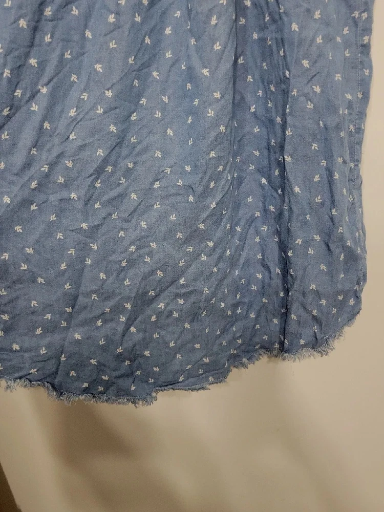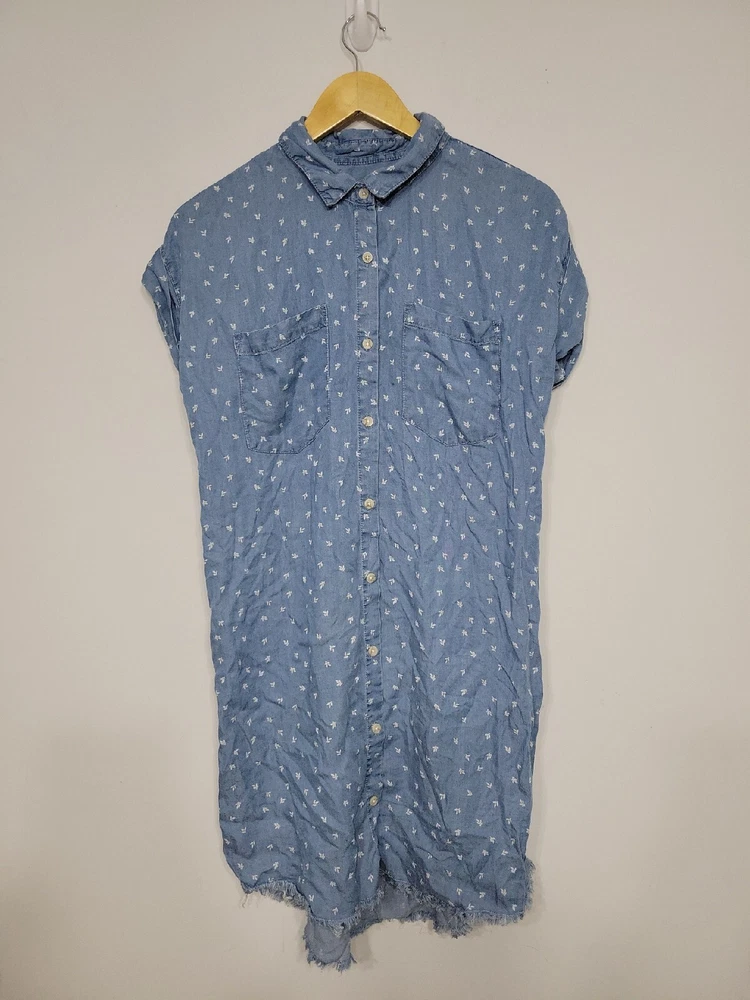 Thread & Supply Women’s Dress Size Small Button-up Fringe. Pre-owned great condition 100 percent lyocell Rolled stitched sleeve button-up t-shirt dress style with leaf detail print 34 inches long 20 inches across 2 front pockets G4F