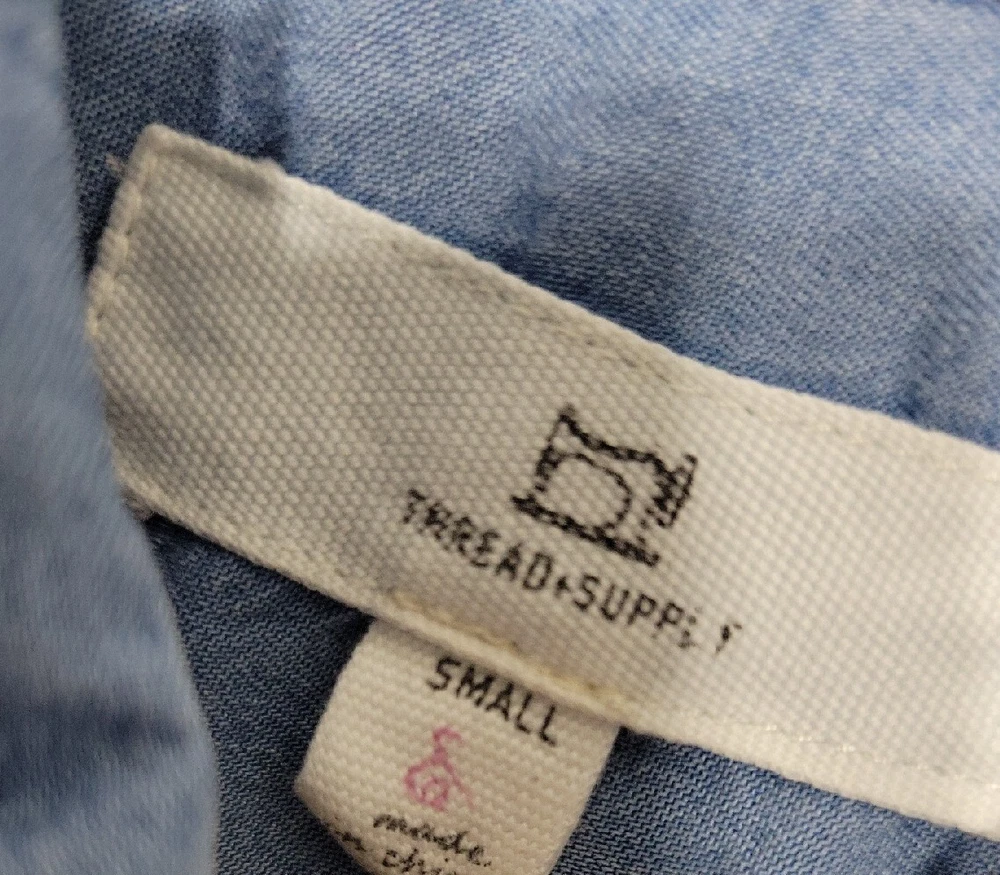 Closure: Button Department: Women Dress Length: Knee Length Color: Blue Material: Lyocell Style: Shirt Dress Sleeve Type: Rolled Brand: Thread & Supply Seller Notes: “great condition, please look at pictures for more details” Size Type: Regular Neckline: Collared Size: S Accents: Fringe Sleeve Length: Short Sleeve