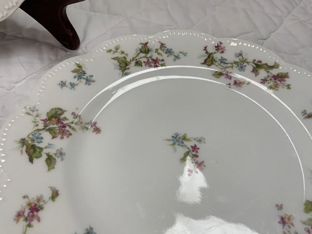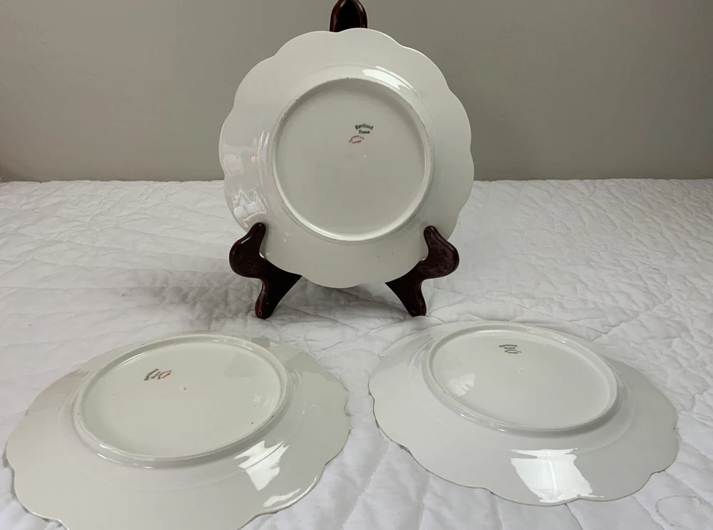 Up for sale is a set of three Haviland Limoges dinner plates. Antique plates made in France. Signed on the back Haviland France Limoges. The design is floral. Very pretty, very delicate design. The colors are off white, blue, green, yellow. Scalloped, dot edges. Measures 9 3/4โ€ round. In diameter. Hand painted. Made in France. Antique plates. Set of 3. Very, very good condition. One very slight spot of roughness, about the size of a pinhead. No chips, no cracks, no hairlines. Thank you and happy bidding. I will combine shipping charges. Smoke free home. Please make payment in three days. ~~~~Please visit my eBay store: webbsamericancountry1๐Ÿ‡บ๐Ÿ‡ธ for over 2000 vintage and collectible items.~~~~๐ŸŒบ๐ŸŒผ๐ŸŒน