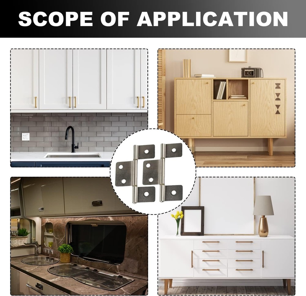 Three Leaf Non-Mortised Hinge for Mobile Home & RV Interior Bifold Door Hinges Silver 2 Pack Door Hinges with Screws Three Leaf Non-Mortised Hinge for Mobile Home & RV Interior Bifold Door Hinges Silver 2 Pack Door Hinges with Screws FREE AND FAST SHIPPING! About this item Versatile Application: Bifold Butt Cabinet Hinges are widely utilized and perfectly suited for a multitude of furniture pieces, including cabinet doors, cupboards, shutters, hinged-lid boxes, cases, windows, and numerous other fixtures, providing a reliable and functional hinge solution. Product size: Cabinet hinges Middle Leaf 1.51 inches,Top and Bottom Leaf 0.91 inches,Total length 3.46 inches,Screw 0.74 inches. Product Features:The Three Leaf Non-Mortised Bifold Door Hinges offer unparalleled versatility with their 360° rotation capability, ensuring smooth operation without jamming or stagnation. Additionally, they are designed for effortless installation, making them a convenient and reliable choice for your furniture projects. Premium Quality: Our cabinet door hinges, crafted from superior quality metal, boast exceptional strength and durability. The electroplated surface undergoes a rust- and corrosion-resistant treatment, ensuring long-lasting beauty and performance. If You Have Any Questions About The Product, Or Have Any Questions After Receiving The Product, Please Be Sure To Contact Us First! We Will Try Our Best To Solve The Problem For You! Product We offer a 30-Day Return Policy on items which you are not completely satisfied with. You have the option for a full-refund or an exchange of the item. No returns are available on items shipped outside of the US . Shipping We offer Free Shipping to the US and ship within 2 business days of payment, usually sooner. We use UPS express shipping. That's why your products are usually delivered within 3 days . Contact We try our very best to make sure every customer is completely satisfied. If there's a problem , message us! We're happy to help. 24/7 live chat available.