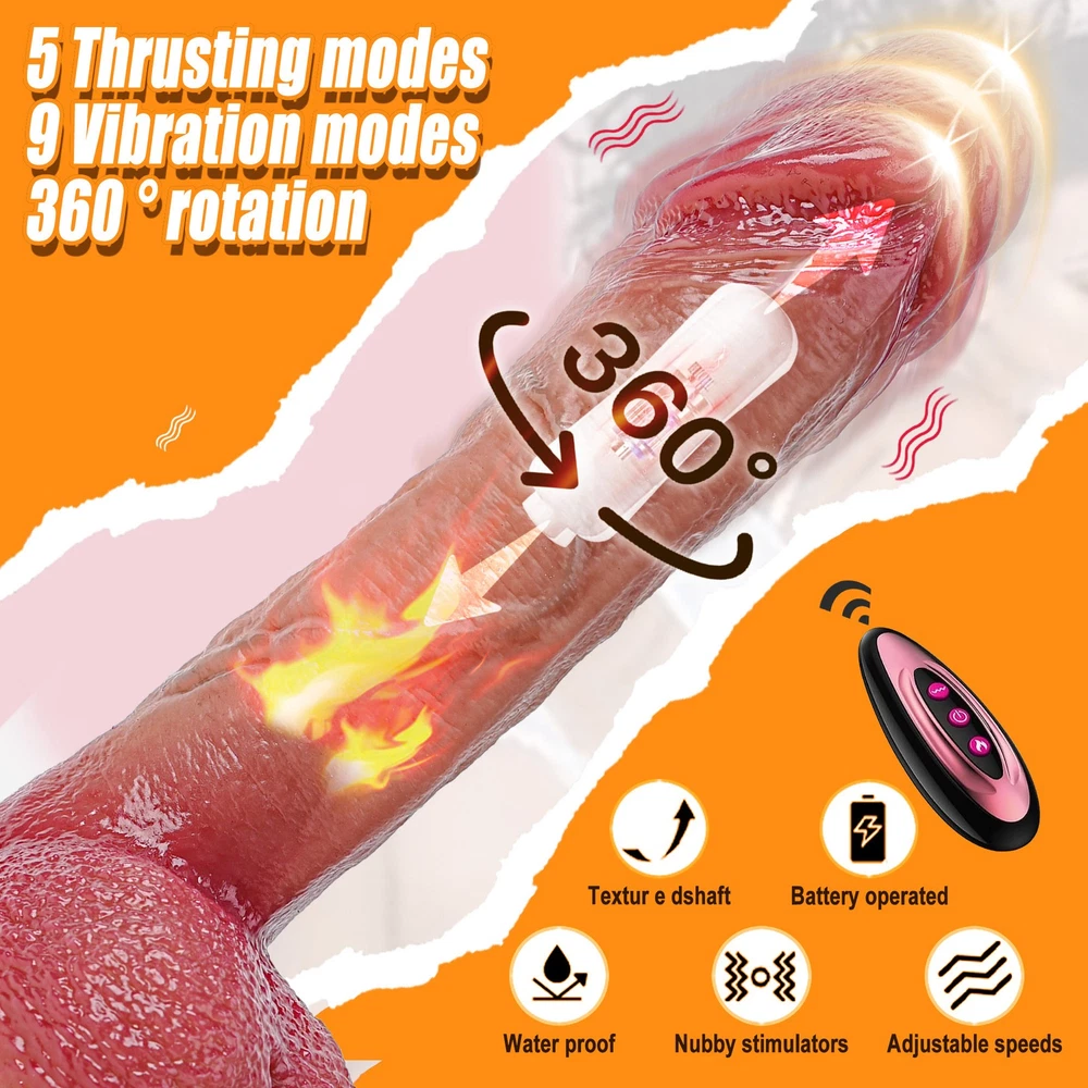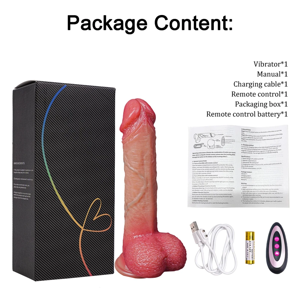 DISCREET PACKAGING We will ship your package discreetly in an unmarked box, Your used id, name or information will only be available to us ,other buyer can't see If you have any questions, please contact us, We are care about your shopping experience and the performance of the product. Features(About the item): About this item: 【9 Vibration Modes】 Dildo built-in powerful motor in the glans part, featuring 9 vibration modes , providing intervals, continuous patterns, and high frequency but minimal noise.Ensuring intense and screet stimulation. 【5 Thrusting and Rotation Modes】 Short press thrusting / vibration button to cycle through the thrusting and vibration mode .5 thrusting modes can be selected . 【Realistic Thrusting Dildos Vibrator for Women】 - This g-spot dildo stimulator looks exactly like a real penis, with thrusting, vibrating, heating functions. The vivid glans of the dildo, the lifelike penis veins, the plump wrinkle ball, the thickly turned penis shaft, when you touch the dildo, experience the real touch stimulation, the strong stretching and vibrating stimulates the vaginal G-spot, and the warm heating design feels real skin temperature. 【 Remote Control Design for Womern Pleasure】 - The anal dildo comes with an original remote control that allows you to remotely control the product and switch thrusting and vibrating modes. From a remote control distance you can have your partner or friend stand at a distance and control your climax. It\'s really convenient to have this remote control for hands-free play when you\'re using the toy alone. 【Skin-Friendly Silicone Waterproof Material】 - This realistic dildos is made of silicone with a soft and silky skin-friendly design, just like real skin contact with vaginal stimulation. The dildo is waterproof design, you can feel passion in the water, compared to traditional toys, this toy is more deeply rooted in the heart, water fun, more play, and easy to clean and easy to use. 【Strong Suction Cup & Hands-Free Toys】 - This telescopic dildo toys is designed with powerful suction cups in mind for the variety of gameplay as well as ease of use, giving you a strong hands-free toy that allows you to enjoy a variety of positions. You can use it on any flat surface and stick firmly to smooth surfaces such as bathrooms, kitchens, bedrooms, wooden doors, tables, walls, floors. Specification *Rated voltage 3.7V, rated current 8A * Color: Flesh * Full length: 8.46inch(21.5cm) * Insertion length: 6.29inch(16cm) * Diameter: 1.38inch(3.5cm) * Waterproof: Easy to Clean, but Do not soak the motor in water * Remote control battery: 12V27A * Heating Fuction * Material: Liquid Silicone Notice: 1. Recommended for use with lubricants. 2. It usually takes 90-120s to to heat up,you need to wait for a moment to feel the heating function 3. Clean the product before and after usage. This dildo can not be immersed in water for a long time. 4. Keep it dry and save in a secret place; away from children Package Includes: Vibrator*1 Charging cable*1 Remote control*1 Manual*1
