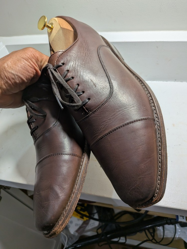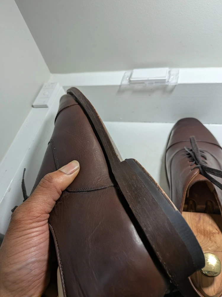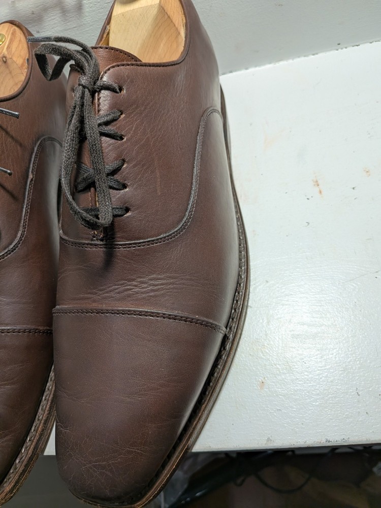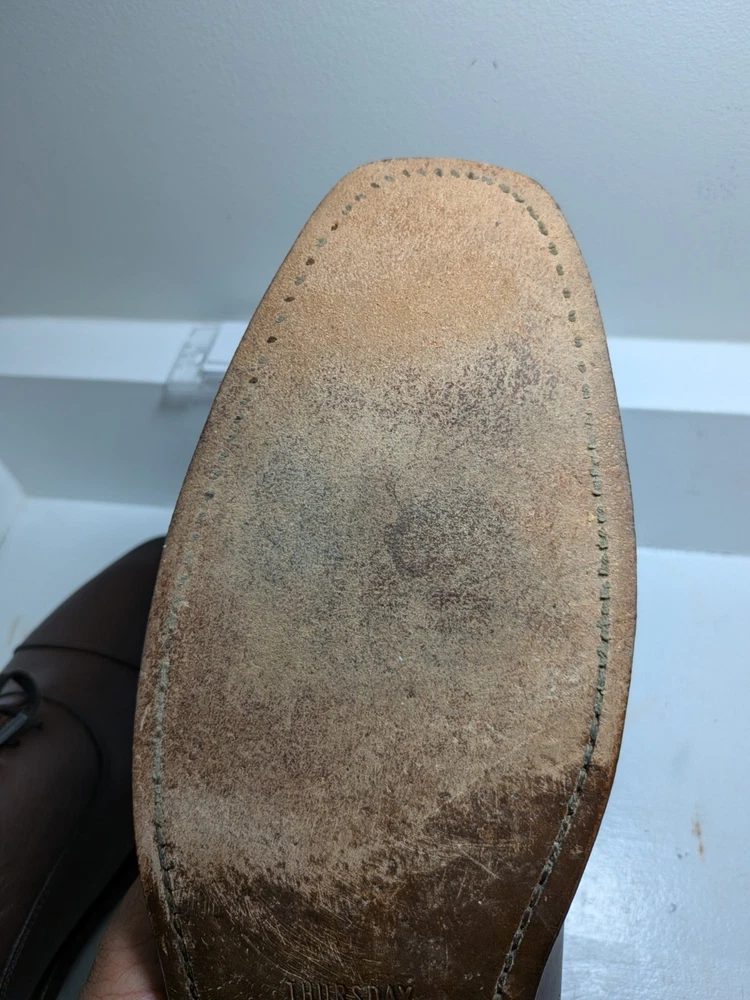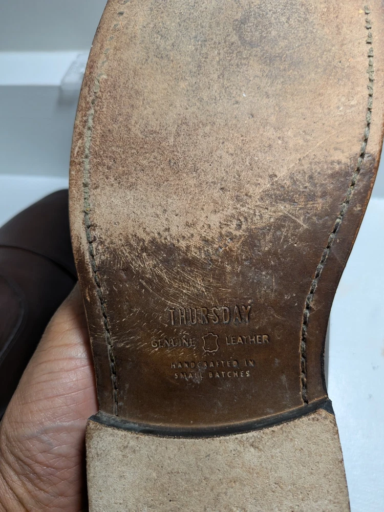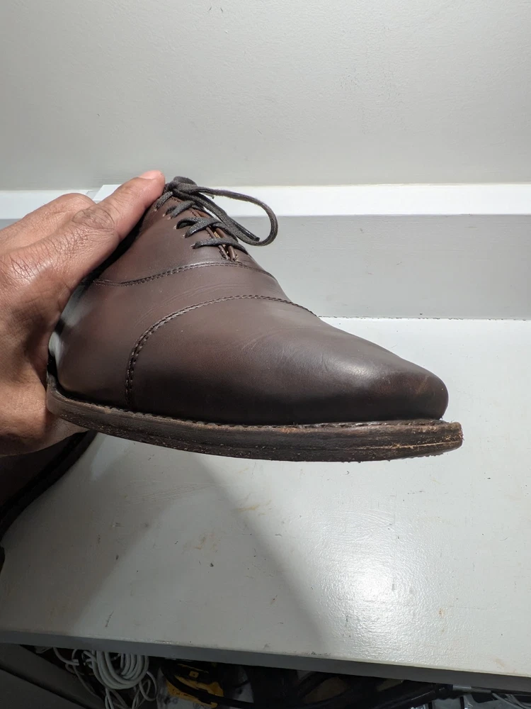 The product is a pair of Thursday men's oxford dress shoes in brown leather with a cap toe design. These shoes are handcrafted and feature a lace-up closure. They are size 10 and are designed with a solid brown color and the brand is Thursday. Made in Mexico, these shoes are perfect for adding a touch of sophistication to any formal or dressy outfit. Shoe trees not included