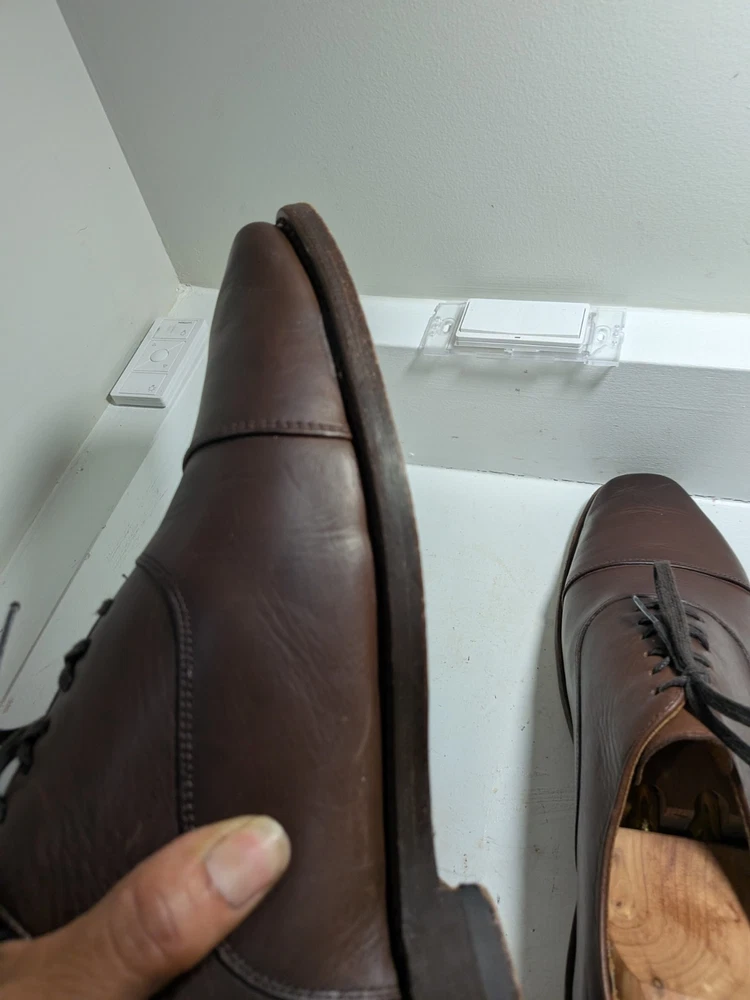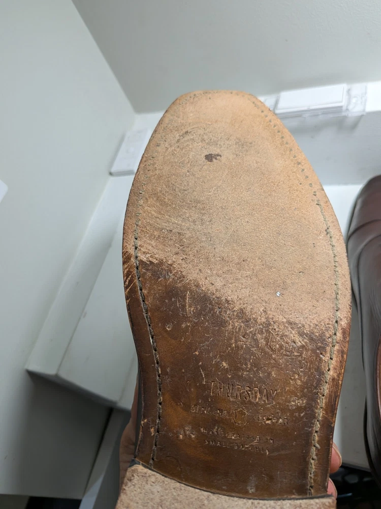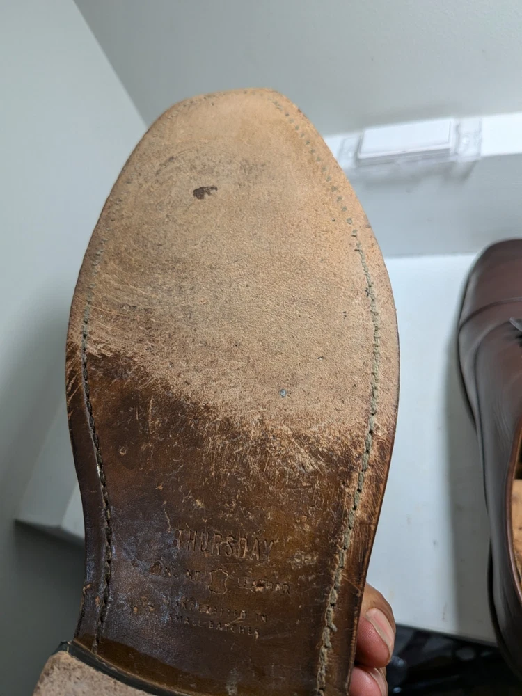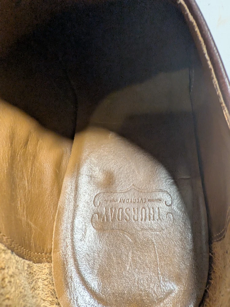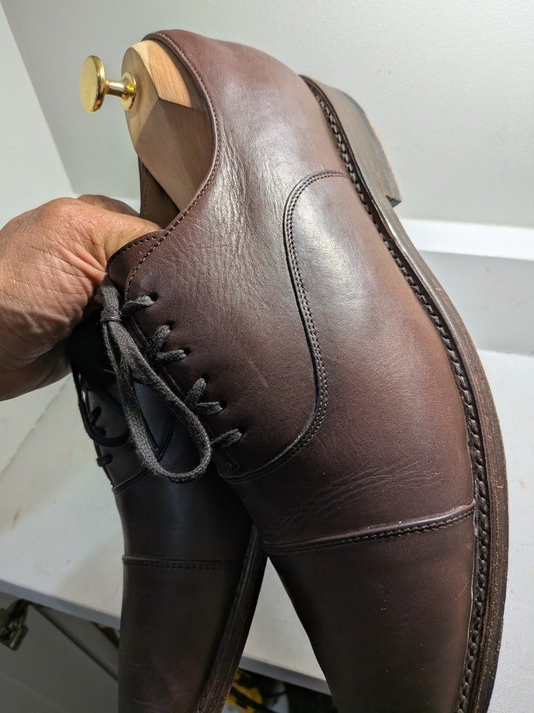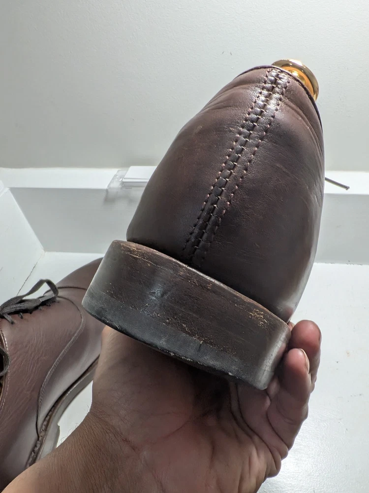 The product is a pair of Thursday men's oxford dress shoes in brown leather with a cap toe design. These shoes are handcrafted and feature a lace-up closure. They are size 10 and are designed with a solid brown color and the brand is Thursday. Made in Mexico, these shoes are perfect for adding a touch of sophistication to any formal or dressy outfit. Shoe trees not included