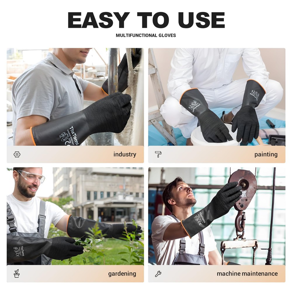 These gloves are amazing! Super soft and thick, yet still flexible enough for precise work. They handle chemicals and rough tasks without tearing, and the anti-slip grip keeps everything secure. Perfect fit for larger hands—no more struggling with tight gloves. Highly recommend for heavy-duty jobs!