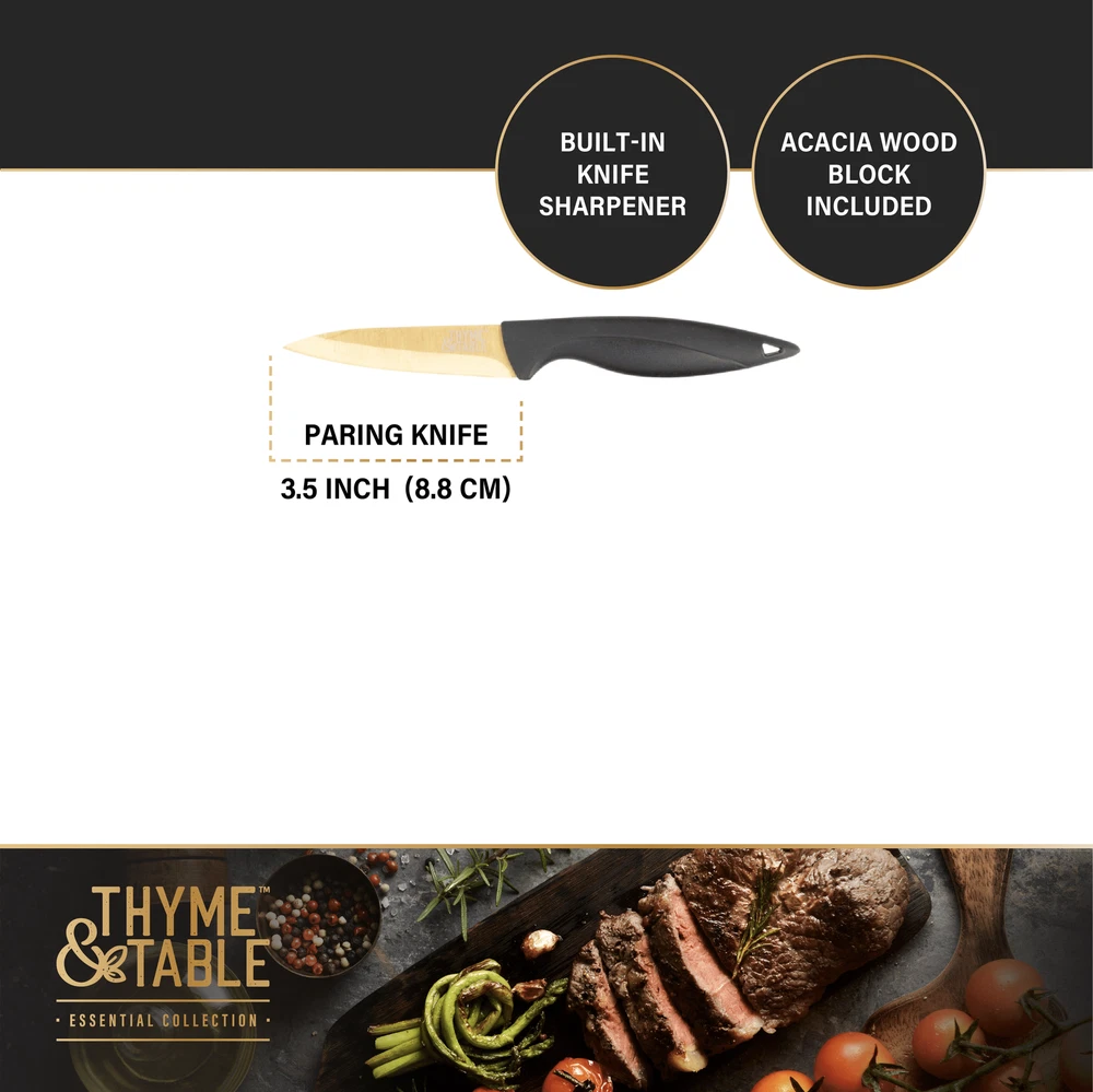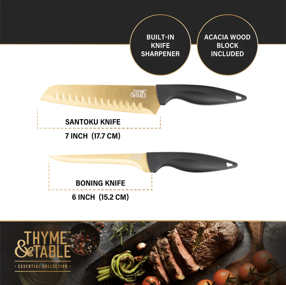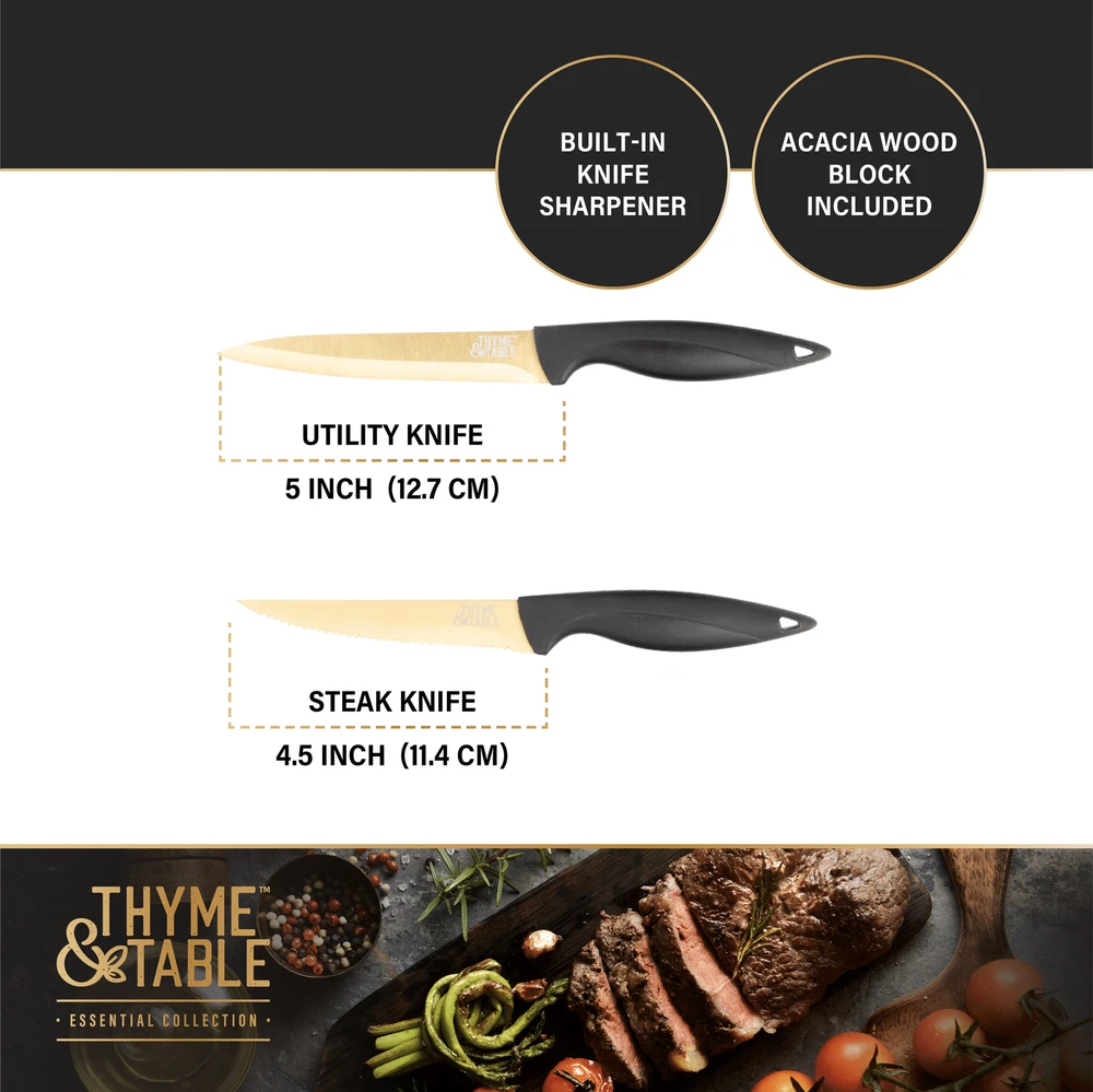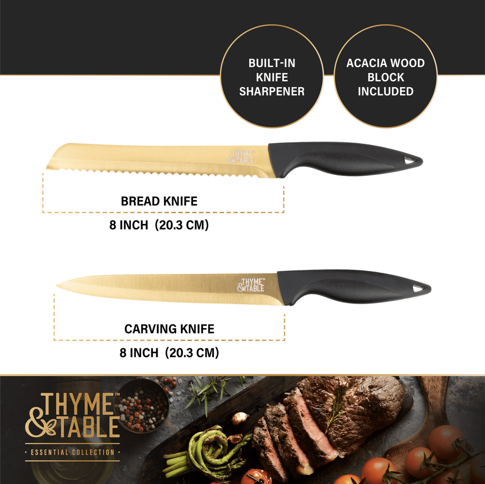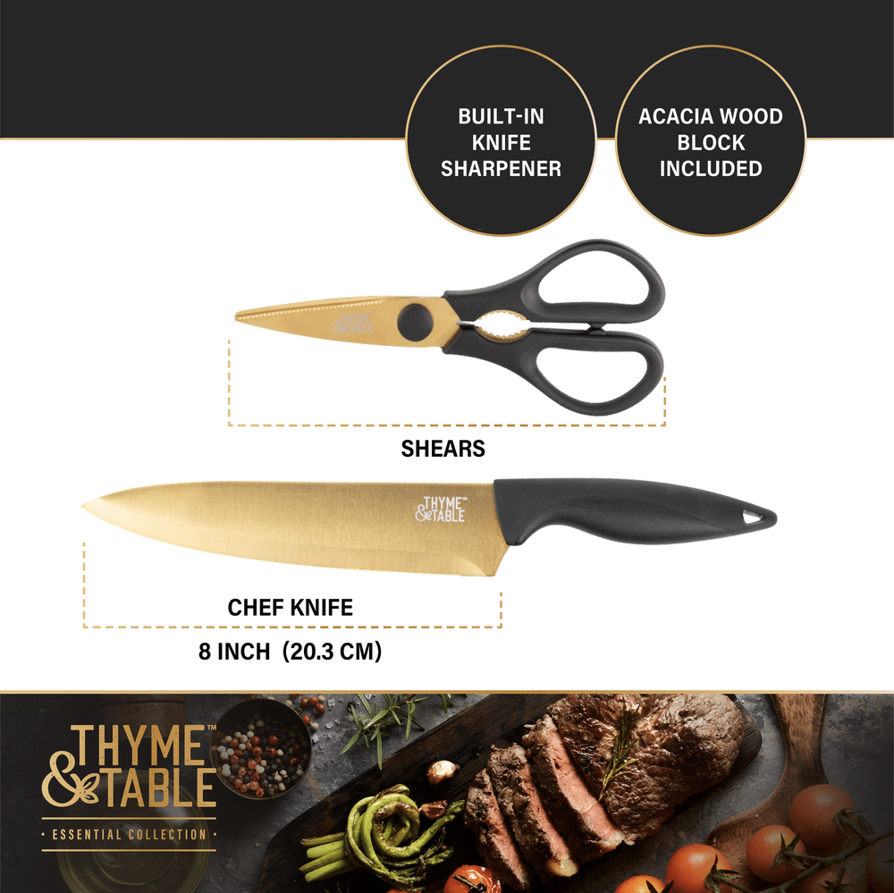 Thyme & Table 15-Piece Knife Block Set is a part of the Thyme & Table Essential Collection. Each knife is made of stainless steel with an ergonomic comfort grip. The knife block is made of Acacia wood and has a built-in knife sharpener. The 15-piece set includes: Stainless Steel Shears 8" Chef Knife 8" Bread Knife 8" Carving Knife 7" Santoku Knife 6" Boning Knife 5" Utility Knife Six 4.5" Steak Knives 3.5" Paring Knife CARE AND USE Hand wash before first use. Do not use in dishwasher. Stainless Steel Blades Acacia Wood Block Included Built-In Knife Sharpener On Feb 18, 2025 at 21:25:26 PST, seller added the following information: