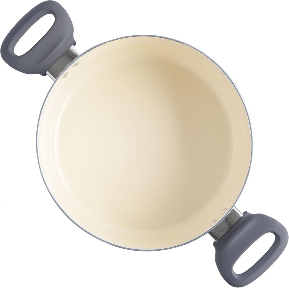 Experience the versatility of the Spice by Tia Mowry Savory Saffron 5 QT Nonstick Ceramic Dutch Oven, a must-have addition to your kitchen cookware collection. Crafted for convenience, this Dutch oven is suitable for both gas and electric stovetops, ensuring you can cook your favorite meals with ease. The round shape and 5-quart capacity make it ideal for a variety of dishes, whether you're braising, roasting, or sautéing. The ceramic construction provides a durable cooking surface that is complemented by a non-stick coating, allowing for easy food release and cleanup. The Dutch oven comes complete with a matching lid, designed to trap heat and flavors, enhancing the cooking process. Its sleek gray color adds a touch of sophistication to your cookware array, making it as stylish as it is functional. HEAVY-GAUGE ALUMINUM CONSTRUCTION: Distributes heat evenly NONSTICK CERAMIC INTERIOR: PFOA-free and BPA-free nonstick surface for healthier, low-oil cooking VIBRANT ENAMEL EXTERIOR: Durable and lively enamel designs that brighten up your kitchen STAY-COOL HANDLES: Soft-touch handles offers safe and secure grips for balance and easy transport VERSATILE: Perfect for sautéing, simmering, steaming, and more. Includes stainless steel steamer insert. CARE INSTRUCTIONS: Handwash recommended, Dishwasher Safe. Oven safe to 300 degrees