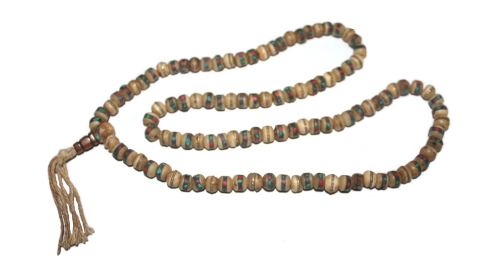 Adjustable wrist mala bracelet This listing is for a Domesticated Bos Grunniens yak bone mala Necklace Prayer beads for meditation. The Measurement of Each embedded bead is 6mm-8 mm. This prayer beads necklace is Handmade in the United States by us (Tibetannepalesejejwelry) Prayer Mala or beads are usually used by all religions around the world such as Hinduism, Buddism, Catholicism, Islam, Sikhism. Since the beads are fingered in an automatic manner, they allow the user to keep track of how many prayers have been said with a minimal amount of conscious effort, which in turn allows greater attention to be paid to the prayers themselves.