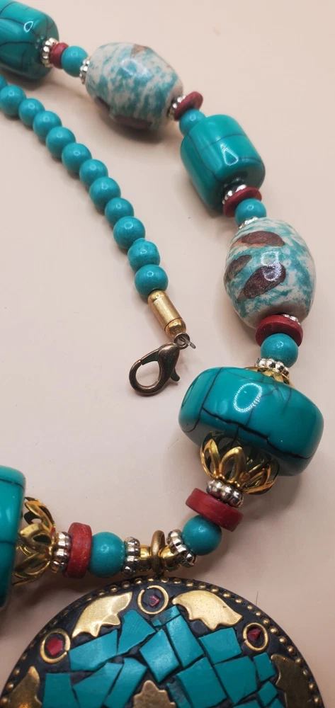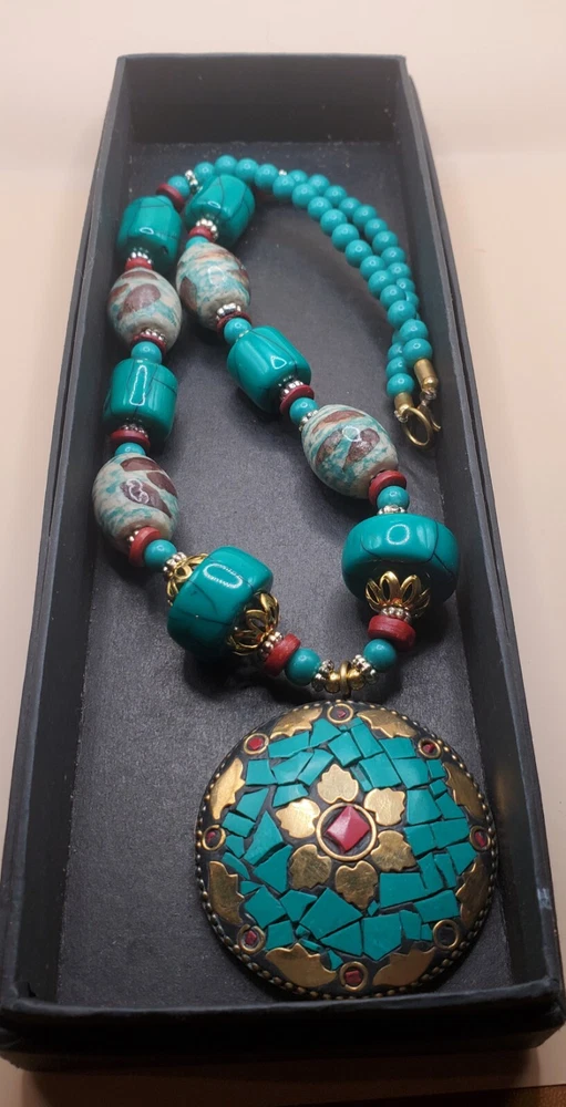 This beautiful handcrafted necklace is a stunning example of Tibetan jewelry artistry. The intricate beadwork and use of natural stone make it a unique piece that will be treasured for years to come. The large round pendant features red and turquoise color stone inlay and brass accents. The necklace is made of red and turquoise color beads. The round pendant is 2" across. The necklace measures 21 inches in length and weighs 3.5 ounces. It is perfect for anyone wants to add a statement necklace with a touch of cultural elegance to their wardrobe. This necklace is in good condition. Includes black gift box.