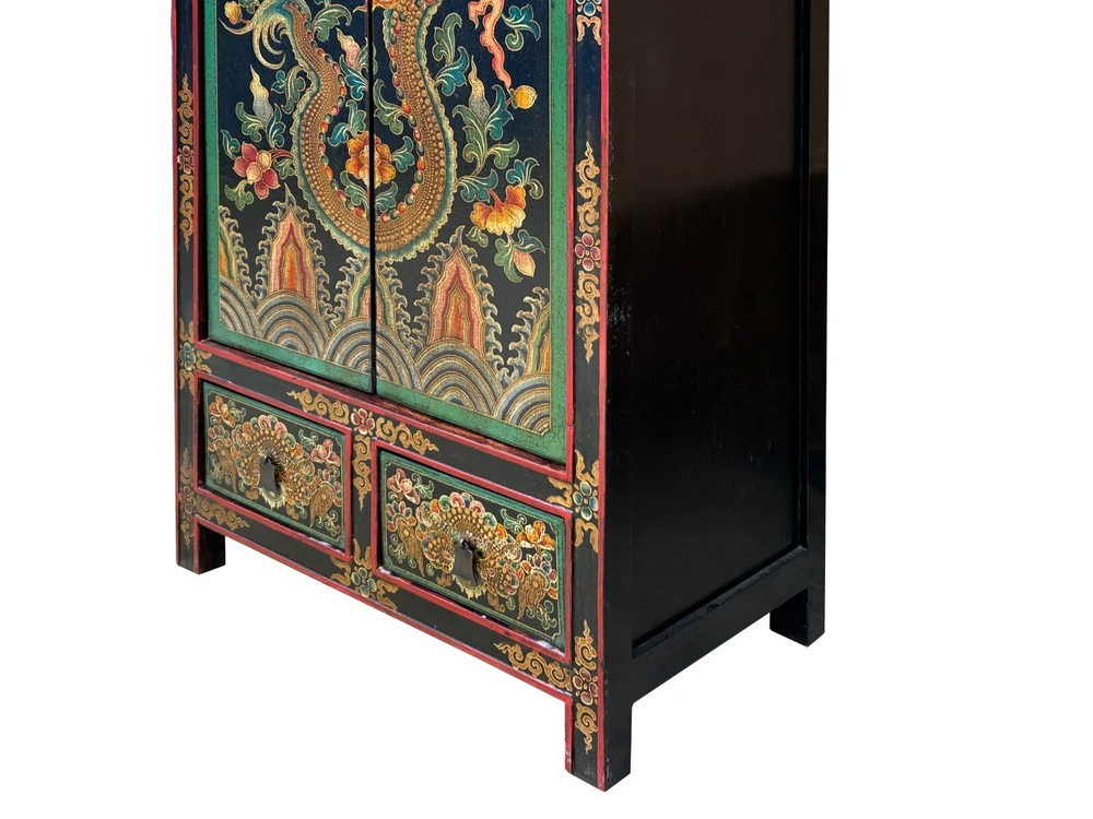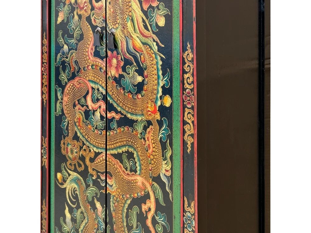 Tibetan Style Golden Dragon Graphic Tall Slim Narrow Storage Cabinet ws4610 DESCRIPTION This striking tall cabinet showcases exquisite Tibetan artistry, likely a vintage or antique piece that serves as a captivating focal point. The double doors are adorned with a dramatic, hand-painted golden dragon, a powerful symbol of good fortune, strength, and wisdom in Tibetan culture. The intricate details of the dragon are further enhanced by surrounding floral and geometric motifs, characteristic of traditional Tibetan design and often imbued with Buddhist symbolism. The cabinet features a dark, possibly lacquered background that accentuates the vibrant colors of the artwork. With additional storage in the lower section, this unique piece offers both aesthetic appeal and practicality, perfect for collectors of Asian art, those seeking spiritual and symbolic decor, or anyone desiring a bold and culturally rich statement in their home. Dimensions: w27.5" x d15.5" x h67" Origin: China Material: Wood Condition: hand-made, distressed marks Work : Ship in one piece We offer a flat shipping fee of $445 for customers in the contiguous United States (48 states) for convenient curbside delivery. (Additional shipping costs will apply to customers in New York, Hawaii, Alaska, US Islands, Florida Keywest, or Canada, based on their specific location). The shipping cost includes insurance and handling charges for added protection.For customers in San Francisco or the Bay Area, we provide local delivery at a cost determined by the distance. You can find the exact cost by entering your zip code during checkout. Alternatively, you can pick up your order in-store with no extra shipping fee.If you need extra care and a white-glove experience, we offer a specialized service with a 4-8 week transit time, tailored to your destination. Contact us for a detailed quote on this service.Upon receiving your shipment, please carefully inspect the exterior packaging while the delivery personnel are present. Note any visible damage on the delivery paperwork, as carriers do not typically honor concealed damage claims. Your cooperation in documenting any visible damage is greatly appreciated Shipping Payment Return Contact Us Shipping Payment Return Contact Us US domestic continental buyer of 48 state pays listed shipping charge for curbside delivery. Customer from Hawaii, Alaska, US Island, Florida Key West and Canada pays extra Shipping cost. Insurance and handling charge are included in the shipping cost. Curbside - trucker drops off the pallet roadside of your location. We normally ship within 5 to 7 business days after payment, usually sooner. When your shipment is delivered, carefully inspect the outside of the packaging before the delivery personnel leave. It is important to clearly indicate if there is any visible damage to the packaging or items on the delivery paperwork. Carriers usually do not honor concealed damage claims so it is crucial to clearly indicate any visible damage to the packaging or items on the delivery paperwork. In-store pickup is highly welcomed if you are in San Francisco Bay Area (No charged) White Glove In-house Delivery service can be arranged - estimate an additional $500 -$700 based on the furniture size and volume. The Shipping company needs to accumulate shipments to move from coast to coast, so please understand the transit time is about 6 - 8 weeks. For customer who are looking to buy multiple items, we can do combine shipping - several items on the same pallet or small item inside the largest items as long as it can fit in. Global shipping is available, please contact us. We accept Paypal and all major credit card (Visa, Master, American Express and Discover) For internatinal customer, the easiest way is to pay by Paypal, we will only ship to Paypal comfimed address. - In the event that you would like to return your purchase, we allow returns that are processed within the defined return date (the return date is to be found in the return policy/shipping and handling section) - Please contact us for a return authorization and the return shipping address - We advise you to use a reputable carrier service when returning your goods. Please pack all returns appropriately. - Buyer may be responsible for round trip shipping. Damage Claim: For Curbside trucking shipment, please check the product is in good condition before you sign the release paper and accept the shipment. Report to the driver and write a note on the shipping document if there is any damage. Take photos for the record. We are not responsible for any conceded damage reported afterward. Customer is responsible to report any damage as soon as possible after receiving the item, All packing material should be kept for damage claim. We will not responsible for any damage cost if damage claim cannot be filed to the insurance company due to customer mistake " did not keep the original packaging material and box" If you have any question, please contact us via ebay. We usually respond within 10 min during office hour. Monday ~ Sunday (7days 10.00 am till 6.00 pm). See our other items This striking tall cabinet showcases exquisite Tibetan artistry, likely a vintage or antique piece that serves as a captivating focal point. The double doors are adorned with a dramatic, hand-painted golden dragon, a powerful symbol of good fortune, strength, and wisdom in Tibetan culture. The intricate details of the dragon are further enhanced by surrounding floral and geometric motifs, characteristic of traditional Tibetan design and often imbued with Buddhist symbolism. The cabinet features a dark, possibly lacquered background that accentuates the vibrant colors of the artwork. With additional storage in the lower section, this unique piece offers both aesthetic appeal and practicality, perfect for collectors of Asian art, those seeking spiritual and symbolic decor, or anyone desiring a bold and culturally rich statement in their home. Dimensions: w27.5