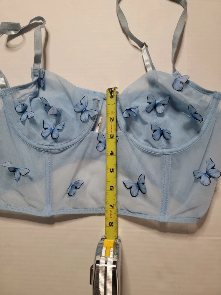 This Tic Toc bralette is a stylish addition to any lingerie collection. The powder blue color and butterfly theme make it a unique piece that is sure to catch the eye. The bralette features a hook and loop closure and adjustable bra straps for a comfortable and secure fit. Made from a combination of nylon and spandex, this bralette is both sheer and comfortable. The strap accents and back closure add an extra touch of elegance to the design. Available in size XL, this bralette is perfect for any woman who wants to feel confident and comfortable in her undergarments.