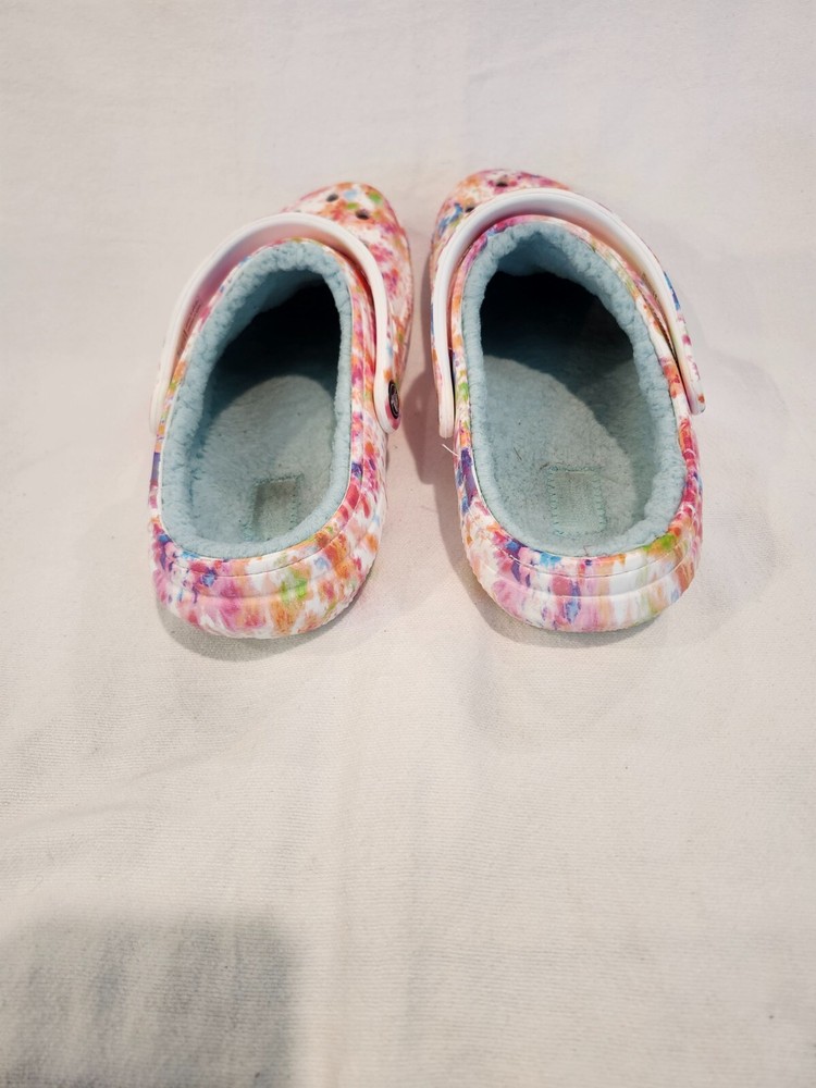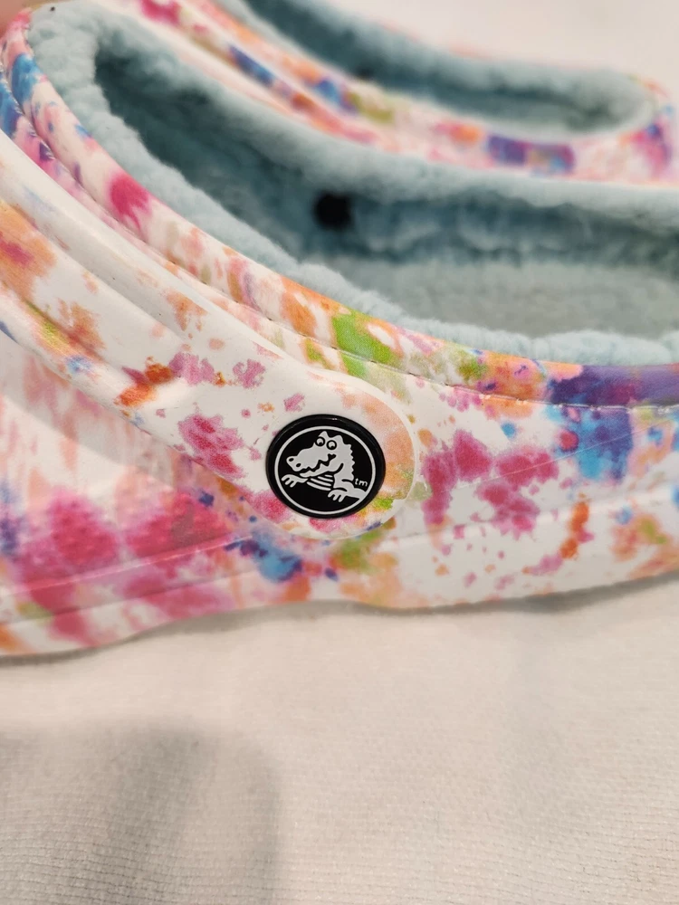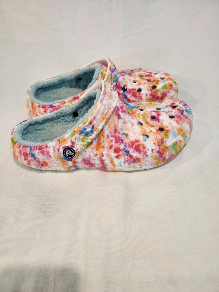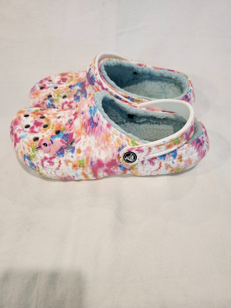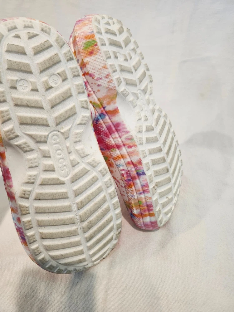 THESE TIE DYE CROCS ARE IN XCELLENT CONDITION. THEY HAVE 1 CHARM ON IT, STILL HAVE A LOT OF WARE IN THEM , WOMENS SZ 9, MEN 7 PRE-OWENED