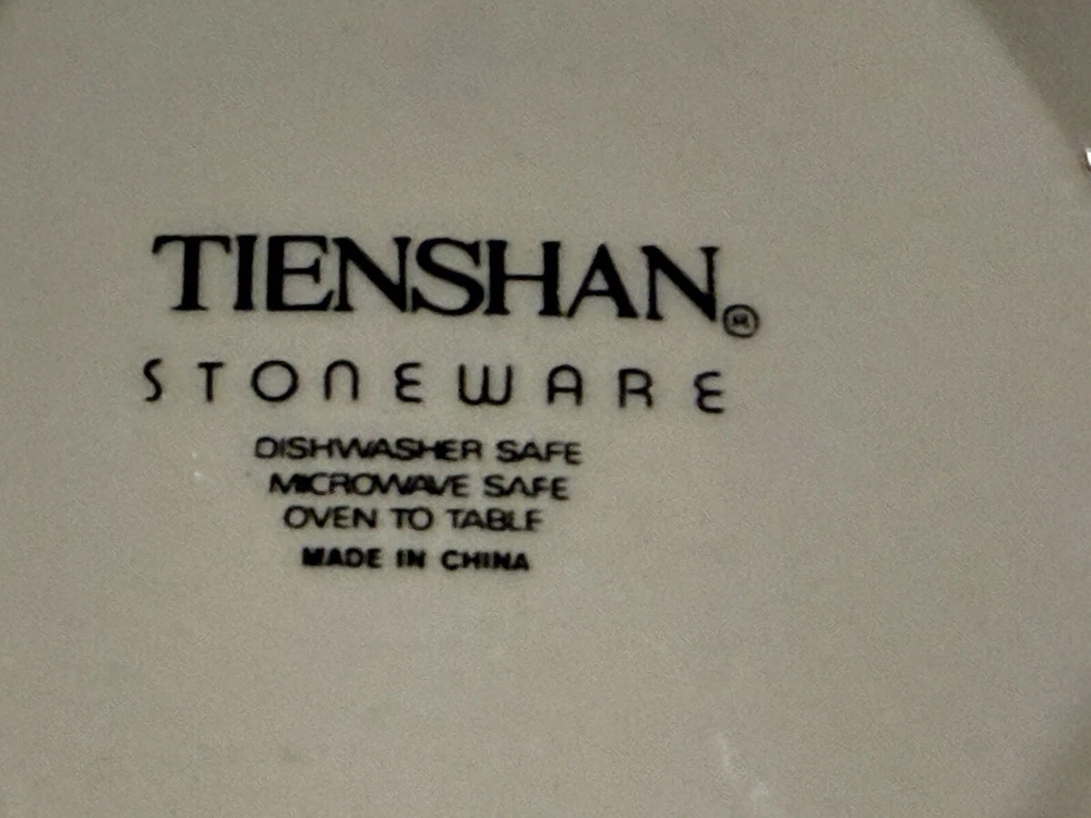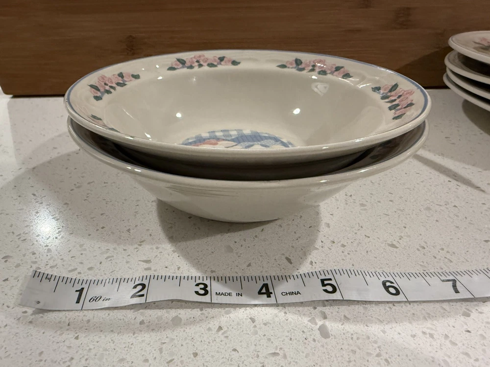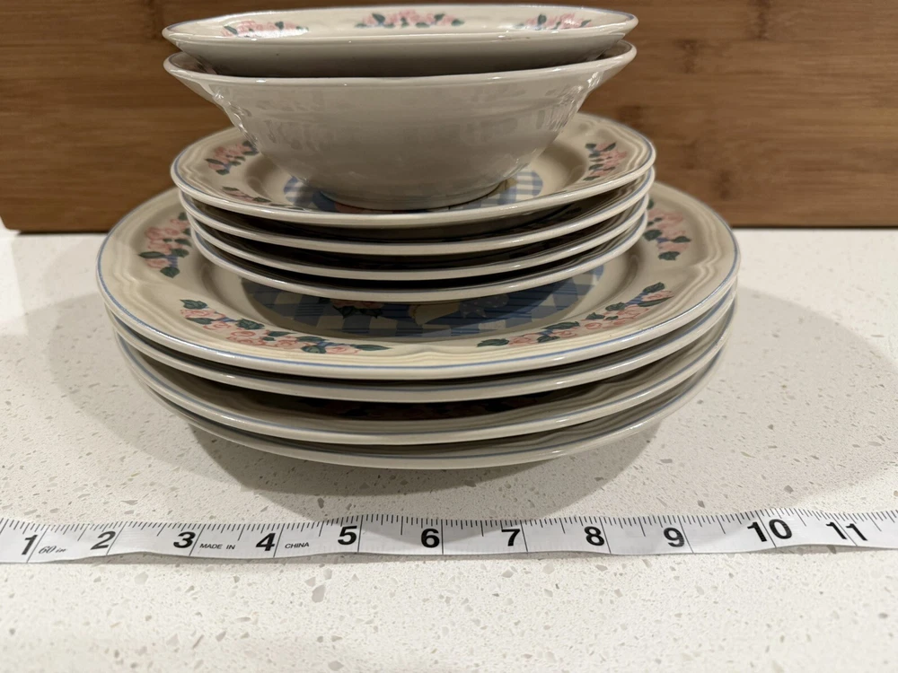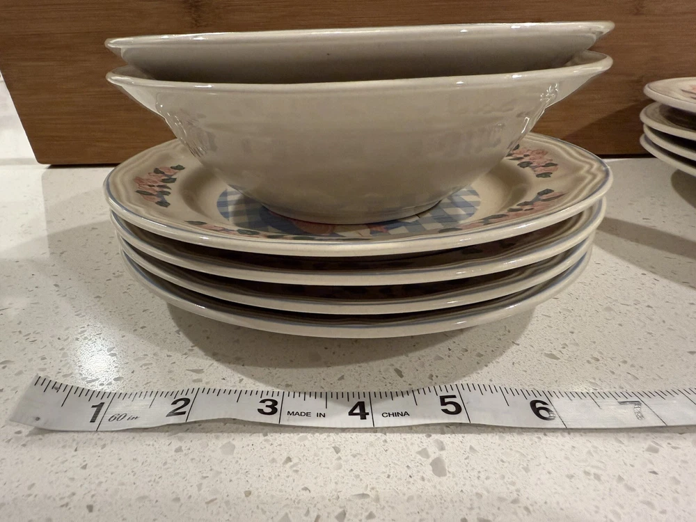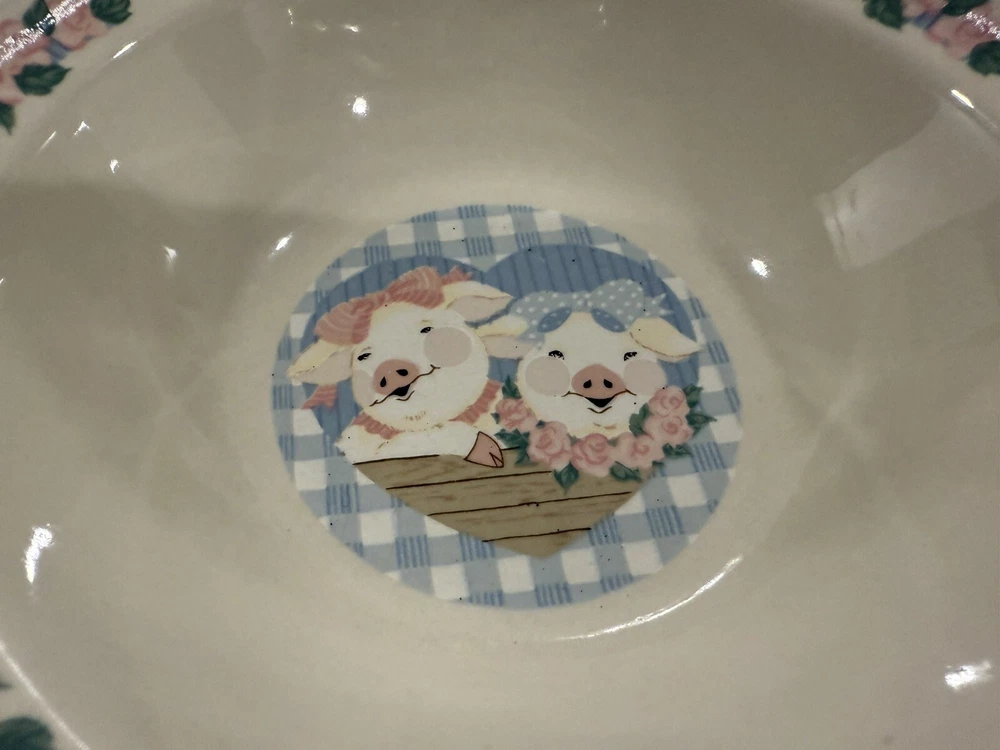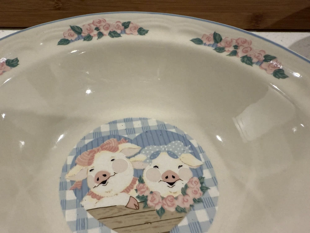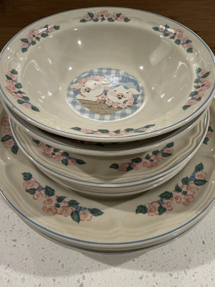 Add a touch of country charm to your dining table with this set of Tienshan Pig Pal stoneware dinner plates. The set includes four round plates, a dessert plate, and a bowl, all featuring a cute and playful pig pal pattern in multicolor. The plates are oven, microwave, and dishwasher safe, making them perfect for use in any occasion. These original late 20th-century plates were manufactured in China using the art pottery production style and finished with a glossy look. The set is perfect for farmhouse-style decor and is sure to impress your guests. The Tienshan Stoneware product line is known for its high-quality and durable pottery, making these plates a great addition to your collection. These dishes are in excellent condition and from a smoke-free home.