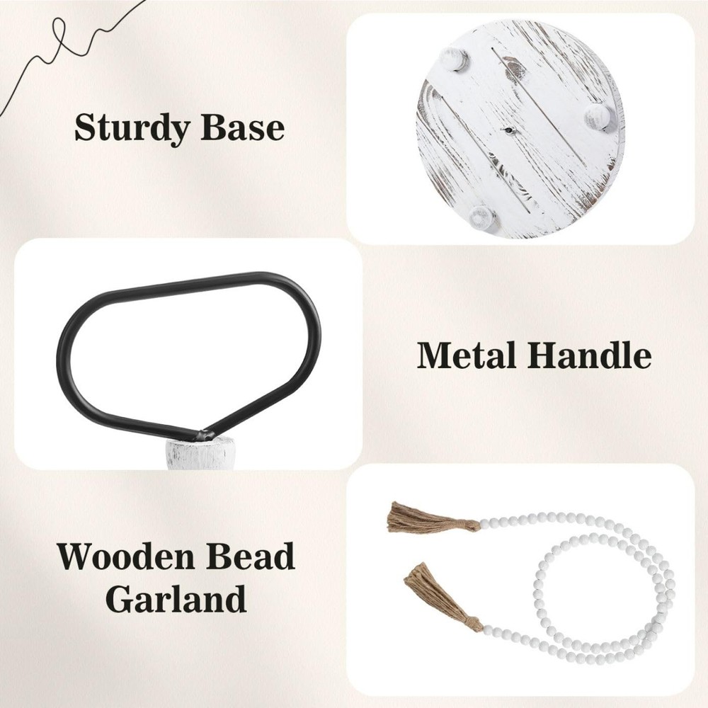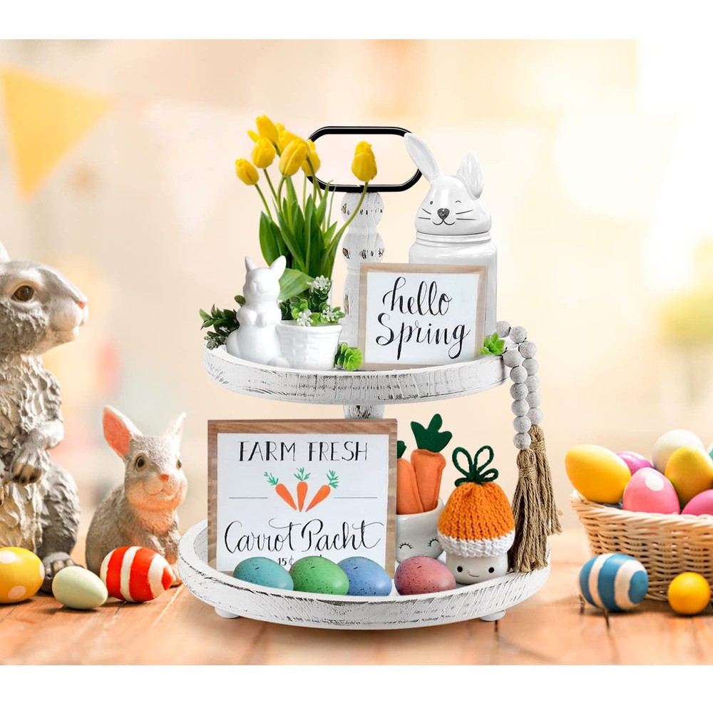 Farmhouse 2 Tiered Tray: This wooden tiered tray comes with a delicate wooden bead garland for decoration, adding an touch of elegant to your home decor. The 2-tier tray features a sturdy metal handle for easy and safe movement. Handmade & Natural Wood: This 2 tiered tray stand is crafted from natural and eco-friendly paulownia wood, 100% handmade by skilled artisans. Each decorative tray boasts a unique texture, and this tiered tray boasts robust construction, ensuring durability and stability for long-term use. Multi-purpose: Perfect for serving, storing, and displaying a variety of items from kitchen essentials to living room decor. You can display it anywhere you like and fill it with many small items and decorations. Various Holiday Decor: This farmhouse decorative tray serves as a versatile option for holiday decorations, such as Christmas, Thanksgiving, Halloween, Easter, Independence Day, family gatherings, housewarming parties, and many other festivals, adding a warm and festive atmosphere to your space. Easy to Assemble: No tools required, install and remove the tiered tray stand in just a few steps. You can break it down into two round trays for individual organizer or decoration, or construct it into a two-tiered tray. Assemble the tiered tray freely according to your preferences.
