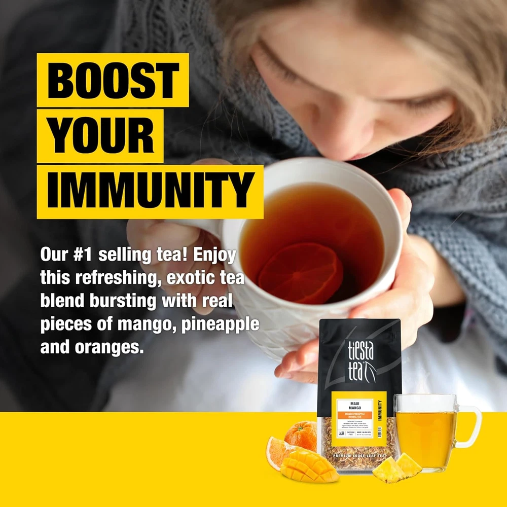Tiesta Tea - Maui Mango | Pineapple Herbal | Bulk Pouch - 200 Cups Product Details Is Discontinued By Manufacturer : No Product Dimensions : 3 x 6 x 11 inches; 15.84 ounces Item model number : 34030 Manufacturer : Tiesta Tea Brand: Tiesta Tea Item Form: Loose Leaves Flavor: Mango Tea Variety: Hibiscus Unit Count: 16.0 Ounce MANGO PINEAPPLE HERBAL TEA: Embark on a tropical getaway with our Maui Mango blend. This exotic concoction of juicy pineapple, zesty oranges, and succulent mangoes will whisk you away to a sunny, sandy paradise with every sip. Whether you prefer it hot or iced, savor the essence of summer with each delightful sip. PREMIUM LOOSE LEAF TEA BLEND: We've artfully combined pineapple, orange slices, hibiscus, and mango to craft a premium caffeine-free tea. Our commitment to quality means you can see, smell, and taste the difference in every cup. Say goodbye to disposable herbal tea bags and embark on a journey to discover the distinctive Tiesta Tea experience. RESEALABLE BULK POUCH FOR TEA LOVERS: Our charming and reusable tin is the perfect gift for tea enthusiasts. Offering airtight storage, it ensures that your mango loose leaf tea remains cozy and fresh for 140-200 cups. Not only a functional addition to your tea collection, but it also sits beautifully on your countertop, a testament to your passion for fine teas. EFFORTLESS BREWING: Enjoy a hassle-free brewing experience with our tropical loose leaf tea. Simply scoop 1.5 tsp of this delightful loose leaf tea blend for every 8 oz of hot water at 208 degrees Fahrenheit. Allow it to steep for 5-7 minutes to release the full spectrum of flavors. Then, savor the moment as you remove the tea leaves and indulge in your perfectly steeped cup. It's the ideal way to appreciate the rich and aromatic notes of our premium blend. SEASONAL FLAVORS: Tiesta Tea’s loose-leaf blends are crafted to enhance your tea experience throughout the colder months. These seasonal favorites deliver a variety of flavors that are easy to brew and enjoy. Whether for personal use or shared during holiday gatherings, Tiesta Tea includes options that match different preferences and occasions.