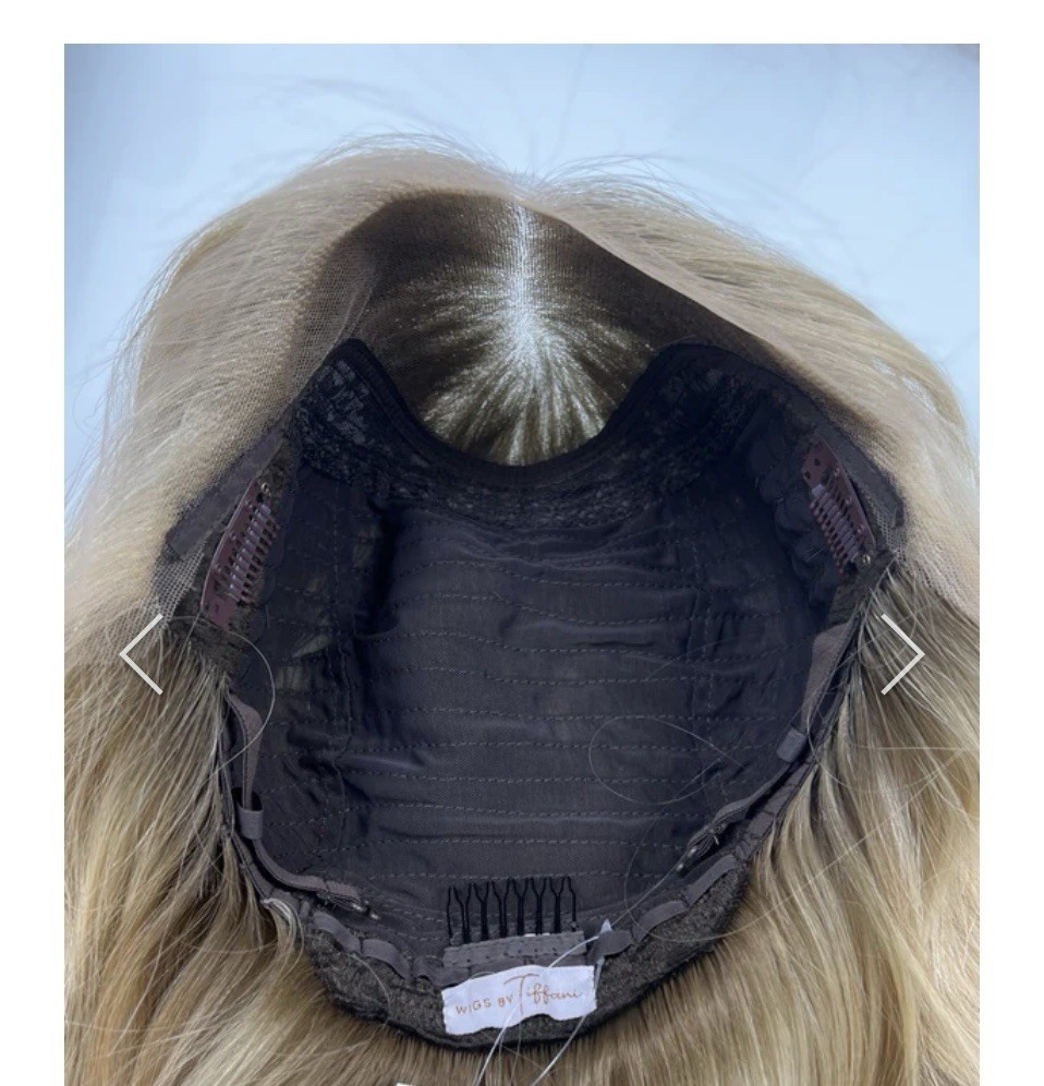 Beautiful golden blonde human hair by Wigs by Tiffani. Hair in excellent condition. Lace front is not torn or damaged but has some knots showing. Size medium