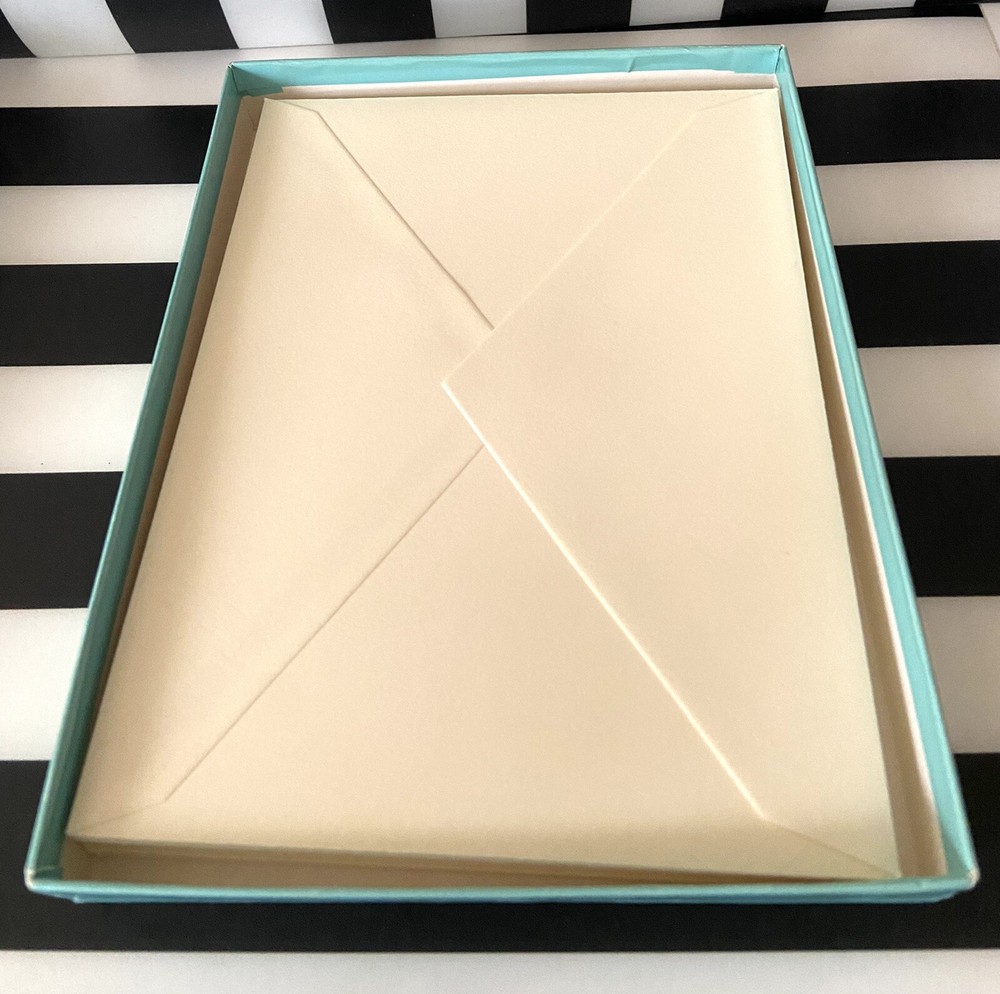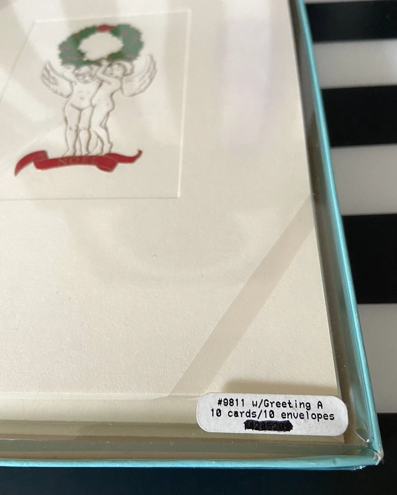 Tiffany & Co. Stationary Folded NOEL WREATH CHERUB Embossed Holiday Greeting Card Set 10 cards 10 Envelopes. Authentic. SOLD AS IS CONDITION. USED TCO CLASSIC LUXURY DESIGN BEAUTIFUL ECRU COLORED PAPER. Pre-Owned OPEN BOX. Box is in good condition, not bad for age. Cards and envelopes are very good condition. Size 7 3/8 x 5 1/2 ” Inches. Designed by Artist Rebecca Shope for Tiffany & Co. Year 1998. Boxed Gift Set. HOLIDAY NOEL CHERUB DESIGN with Holiday Greeting Inside. Collectors Item from year 1998. *****See all photos. What you see is what you get. Minor marks/ flaws to the outside cover box. Really Beautiful Card Set. ******No International shipping or Returns. Comes from a Non c19, pet and smoke free home. *****SHIPPED BY PRIORITY USPS***FAST SAFE AND INSURED TRACKING to USA ONLY. Thanks for shopping. Please See other items. 😉