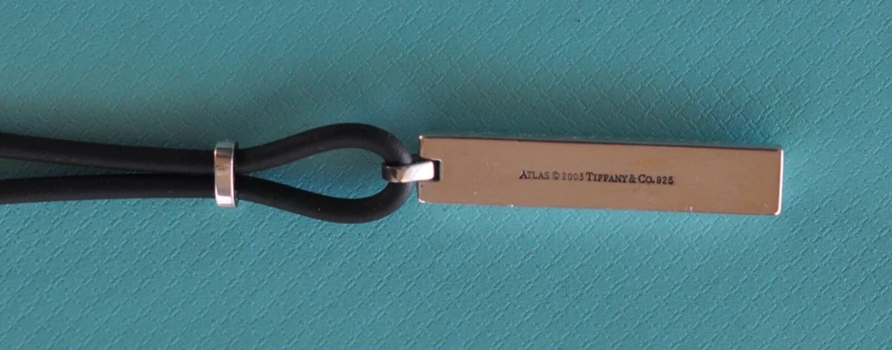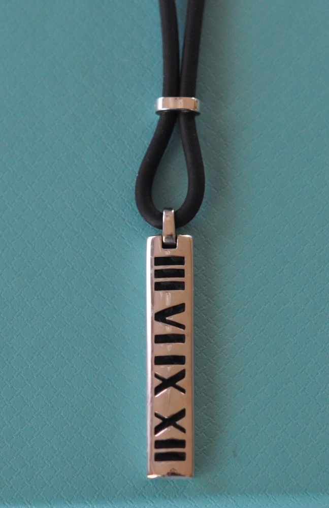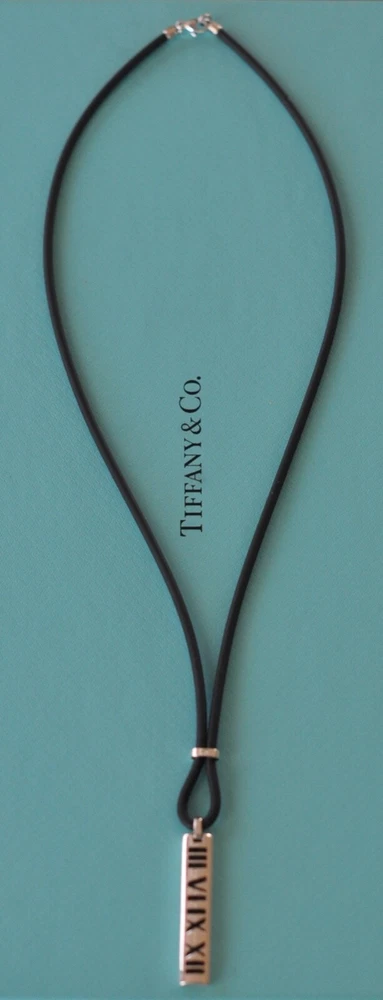 Pendant Shape: Rectangle Base Metal: Sterling Silver gtin13: Does not apply Style: Chain, Pendant Signed: Yes UPC: Does not apply Metal: Sterling Silver Gender: Female Color: Silver Metal Purity: 925 parts per 1000 Type: Necklace Main Stone: No Stone Collection: Tiffany & Co. Atlas Necklace Length: 19 in Chain Type: black rubber cord Modified Item: No Closure: Lobster Theme: Love & Hearts, Love Brand: Tiffany & Co. Model: Tiffany & Co. Atlas Necklace Seller Notes: “Highly Polished. No box or pouch.Please view picture.”