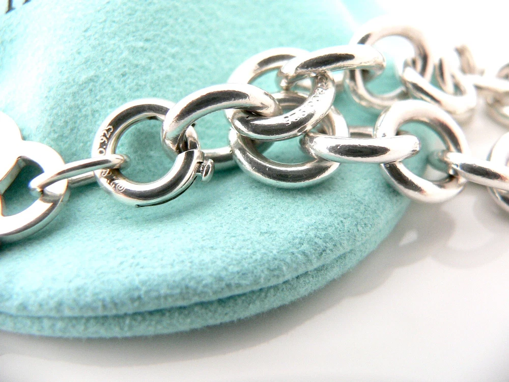 Overview: Here is a gift that she will surely adore! It is shiny, stylish, and super versatile! This piece will make someone REALLY happy! :) Offered for sale is a wonderful Return to Tiffany & Co. Sterling Silver and Blue Enamel Heart Charm Bracelet. Hanging from its bright Tiffany silver chain is a very classic and very pretty Return to Tiffany Heart charm - with Blue Enamel on the other side! The Blue Enamel Heart Charm hangs from a Tiffany & Co. Silver clasp (opens / closes) and thus allows you to use the Heart charm on another bracelet or even as a necklace charm! Super versatile piece! A classic Tiffany piece that any girl will adore! Super cool and classic Tiffany piece! It is simple, elegant, and classic all rolled into one piece. Imagine the piece with your professional office attire ... Now imagine it with jeans or weekend wear ... Perfect! The item is very comfortable to wear, and is in excellent condition. It is THE classic Tiffany piece to start or add to your collection. As always, the item is fully hallmarked and is guaranteed to be 100% authentic. Everyone needs a signature Tiffany piece! Here is the perfect one just for you. The piece will come with its Tiffany pouch as shown! Perfect and ready for gifting! Wonderful present for yourself or anyone you love! Will surely delight! Particulars: The bracelet is 7.5 inches from end to end. Metal & Hallmarks: Return to Tiffany & Co / 925 (on Heart Charm) T & Co. / 925 (Circular Clasp that holds charm / Middle Link of Bracelet) Solid 925 sterling silver Please check out my other unique and interesting Tiffany items on sale.