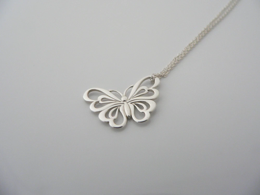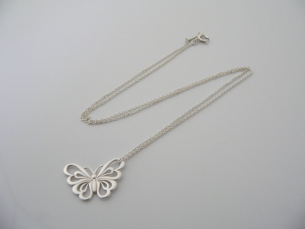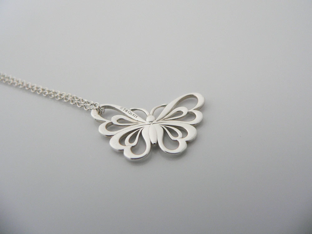 Overview: Offered for sale is a gorgeous and rare Tiffany & Co Nature Butterfly necklace. Crafted from solid and bright Tiffany silver, yet maintains its delicate and feminine feel! You will feel very playful and fun while wearing this- especially while you are outdoors (during the summertime). I am 100% positive that you will want to use this piece over and over again. Your friends will be fascinated by this gorgeous piece – it is almost like a work of art! The look of the piece is simple, classic, and very elegant. The pair works with pretty much anything you put on … and adds a touch of pizzazz to it! A perfect Tiffany piece to start or add to your collection. Both pendant and chain are fully hallmarked, in excellent condition, and guaranteed to be 100% authentic. Wonderful present for yourself or anyone you love! Will surely delight! Particulars: Size & Measurements: The butterfly's wing span is approx. 0.9 inches. The chain is 16 inches from end to end. Metal & Hallmarks: T & Co. / 925 (on Butterfly pendant) Tiffany & Co / 925 (on chain clasp) Solid 925 sterling silver Please check out my other unique and interesting Tiffany items on sale.