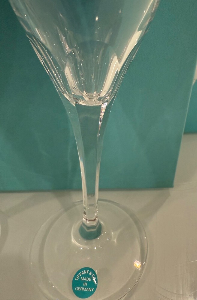 Elevate your drinking experience with this stunning set of (two) Tiffany & Co. champagne flutes. New old stock made in Germany Glasses new 😍never used 😳box has a few marks see all photos 😍😍 Each stemware fluted glass is crafted from exquisite crystal and features a timeless straight tulip shape, with a height of approx. 9 1/2". The glasses are signed by the renowned brand Tiffany & Co. , adding an extra touch of elegance to any occasion. The glasses come with a blue presentation box and are perfect for any celebration or as a thoughtful gift. Whether it's a wedding, anniversary, or just a special evening, these champagne flutes will make your toast unforgettable. These glasses are new in box, never been used. From a smoke free home.