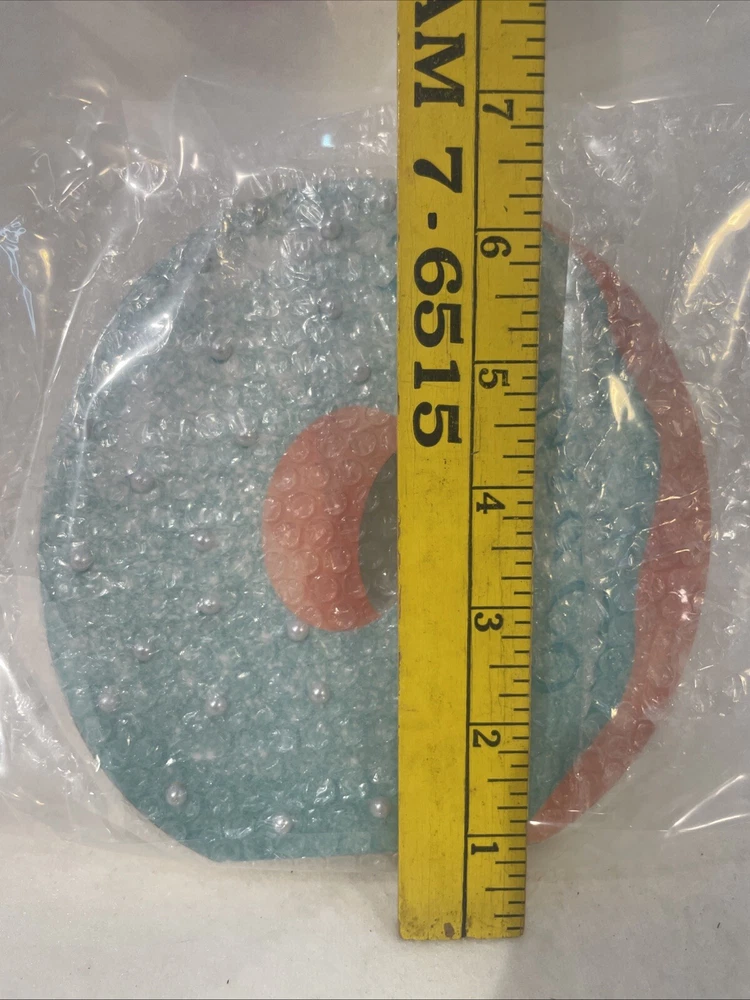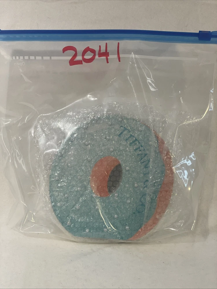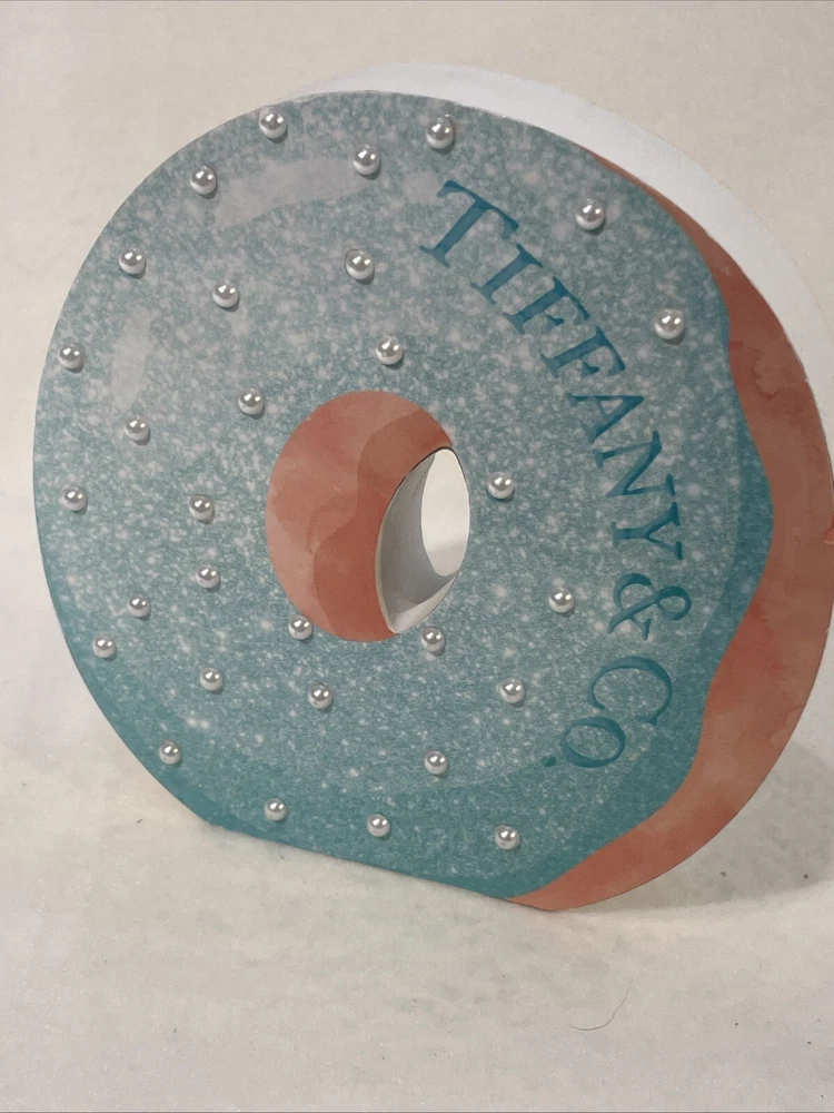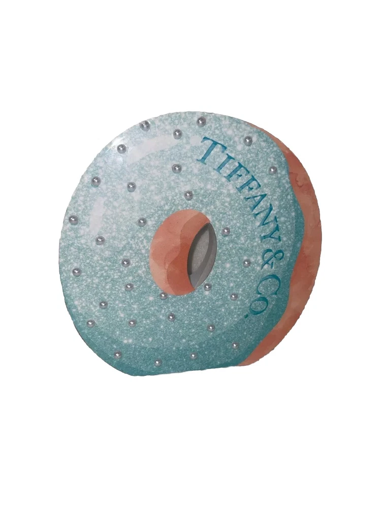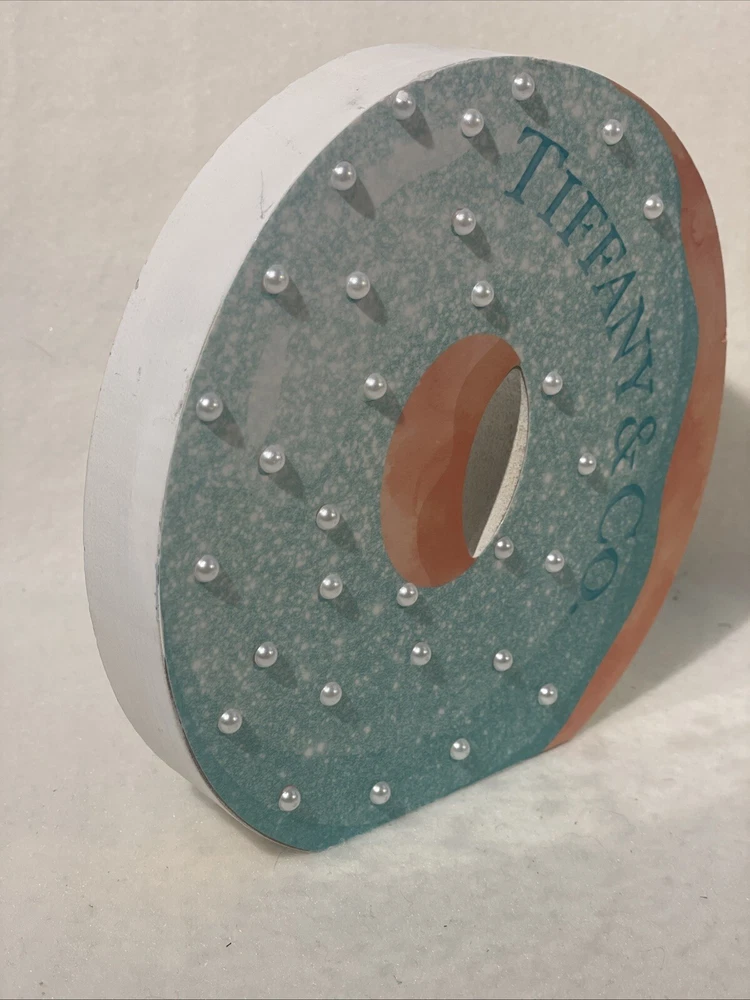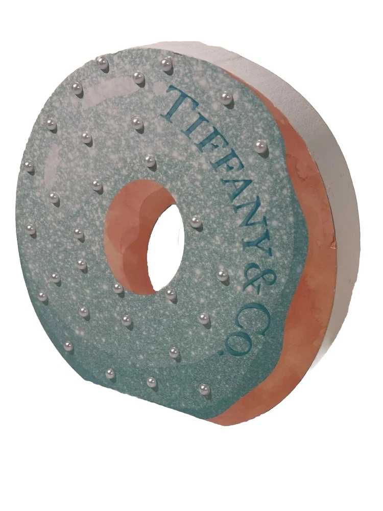Elevate your home decor with this stunning piece of art from Tiffany & Co. Featuring a glossy donut print with faux pearls and flat paint finish, this decorative item measures 6.5 inches in length, 6 inches in height, and 1 inch in width, weighing approximately 10 ounces. The abstract style and 3D effect of this art piece create a unique and eye-catching display, perfect for any room in your home. The piece features a charming donut with pearls in a robins egg blue color, giving it a feminine and artistic touch. This art decor is free-standing and does not require any additional parts to display it. Care instructions include dusting and cleaning with a damp cloth. This item is perfect for teens and adults, and it can be a great addition to any room.