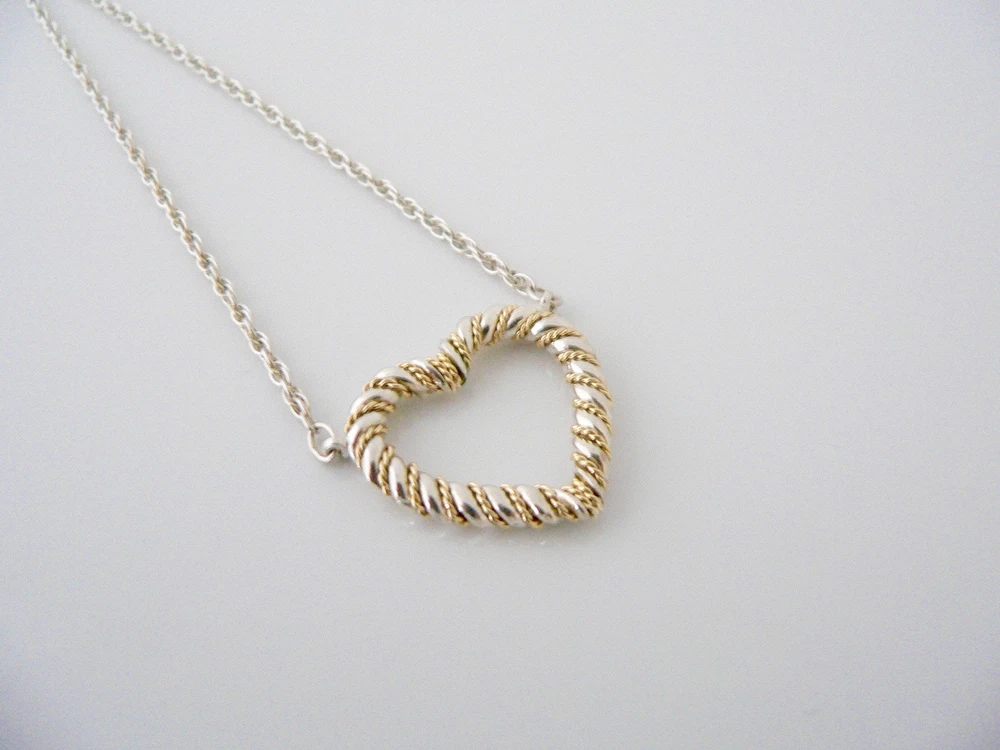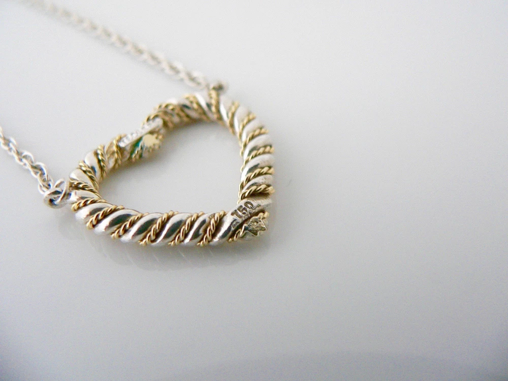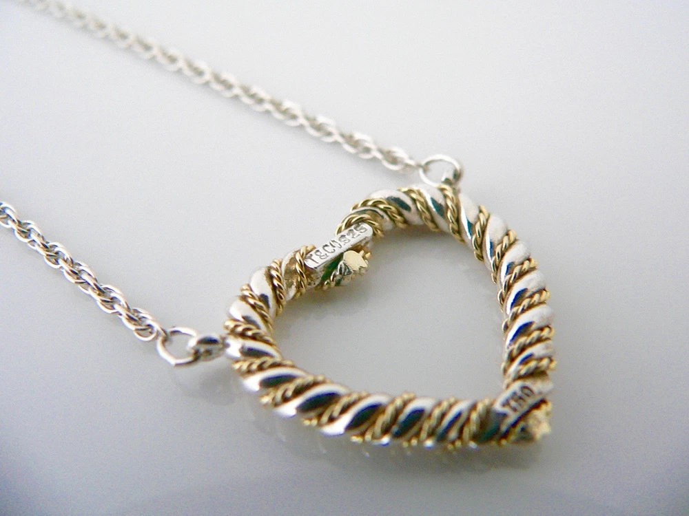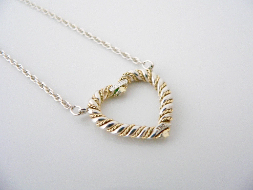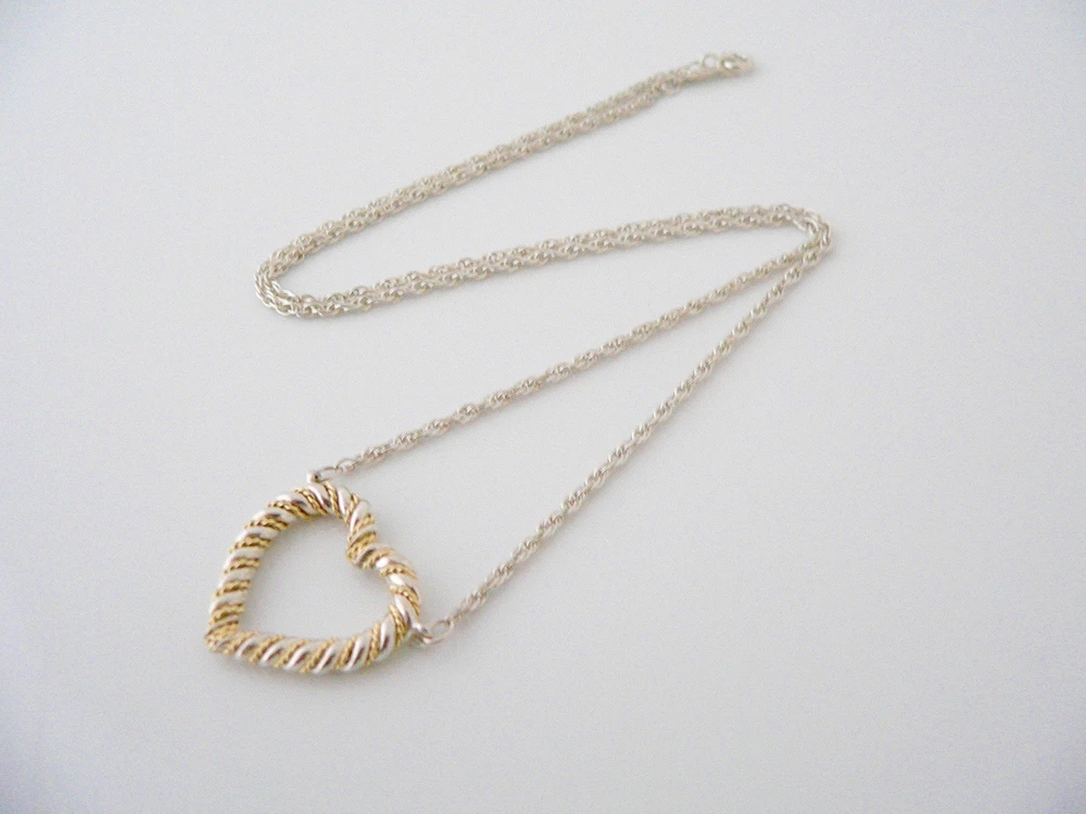 Overview: Time to show off your awesome Tiffany necklace! Offered for sale is a gorgeous and wonderful Tiffany and Co. Sterling Silver 18K Gold Rope Heart necklace. Guaranteed to be a conversation starter! It is just like wearing a piece of art work right on your neck - without the extremely high price! Very elegant, chic and comfortable piece! You will feel both sexy and elegant while wearing this piece. Great necklace to wear for a night in town, at a party, or just going to dinner with friends in jeans or a pretty dress. The style is classic Tiffany, making it a piece that you will most certainly use over and over again. No longer in production, it is perfect for the Tiffany collector. A great Tiffany piece to start or add to your collection. The piece is fully hallmarked and is guaranteed to be 100% authentic. Wonderful present for yourself or anyone you love! Will surely delight! Particulars: Size & Measurements: The necklace is 19 inches from end to end. Metal & Hallmarks: Tiffany & Co. / 925 / 750 Solid 925 sterling silver Please check out my other unique and interesting Tiffany items on sale.