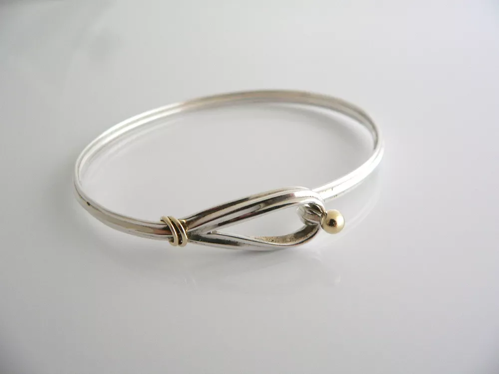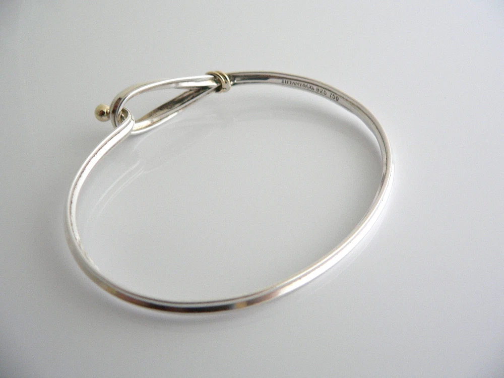 Overview: Offered for sale is a wonderful Tiffany and Co. Silver and 18K Gold Hook and Eye Bracelet / Bangle. The bangle is made from solid Tiffany silver and 18K gold, allowing you to combine the piece with almost any other piece of jewelry you already own. The style is classic Tiffany, making it a piece that you will most certainly use over and over again. It is very comfortable to wear, and is in excellent condition. Great piece to wear to work, or for just going to dinner with friends in jeans or a pretty dress. A great Tiffany piece to start or add to your collection. The bracelet is fully hallmarked and is guaranteed to be 100% authentic. Wonderful present for yourself or anyone you love! Will surely delight! Particulars: Size & Measurements: The widest part of the bangle is approx. 2.5 inches. Metal & Hallmarks: Tiffany & Co. / 925 / 750 Solid 925 sterling silver and 18K solid gold Please check out my other unique and interesting Tiffany items on sale.