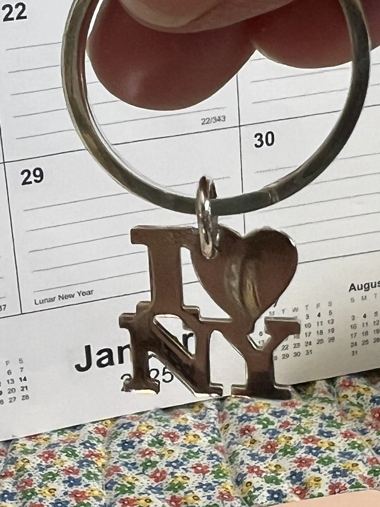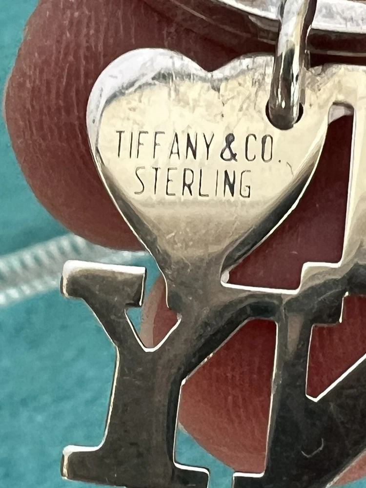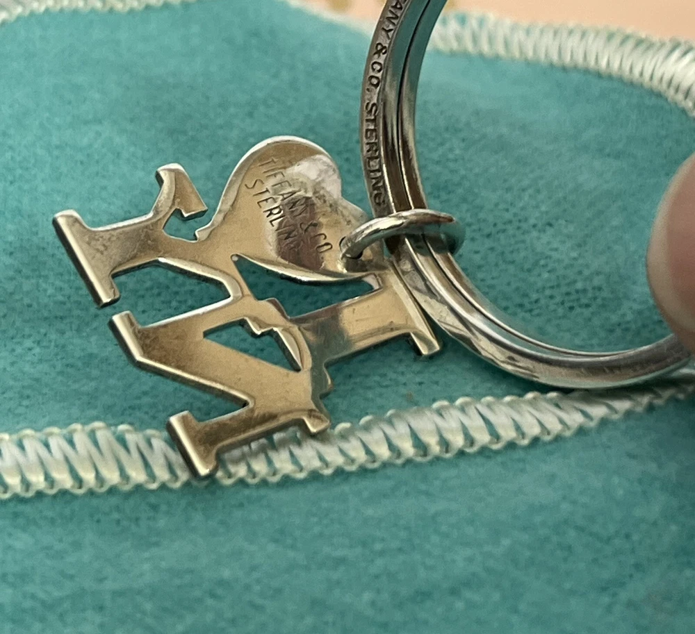 This is a Tiffany & Co. key ring made of 925 sterling silver. It features an "I Love NY" charm, making it a stylish accessory that represents love. The key ring comes with a pouch for safekeeping.