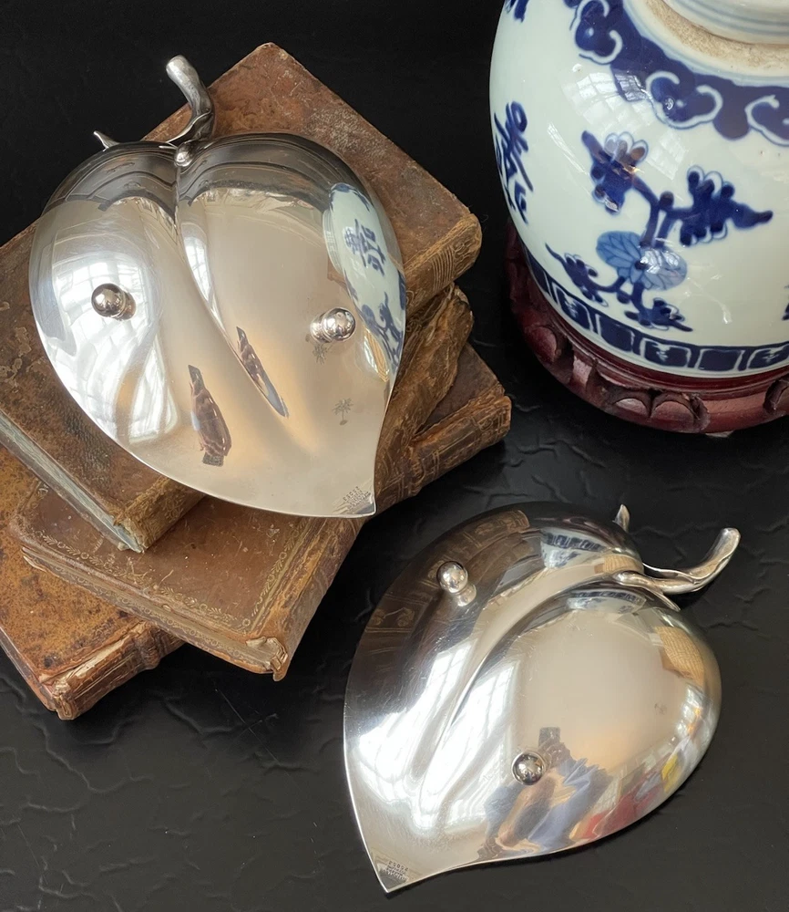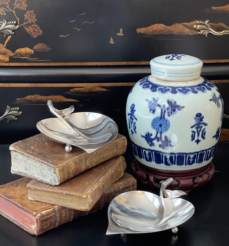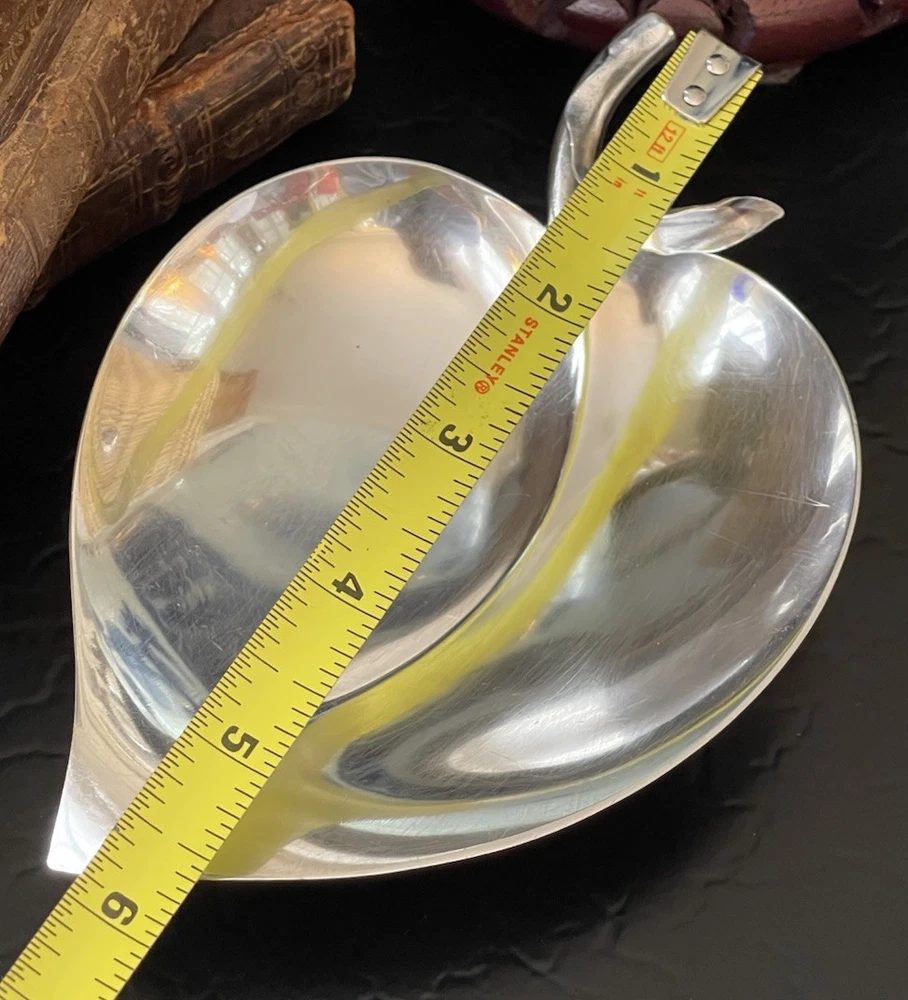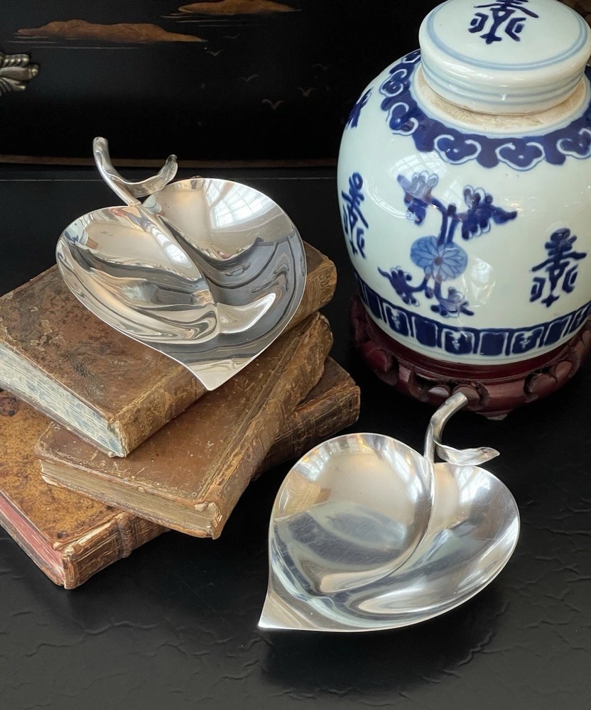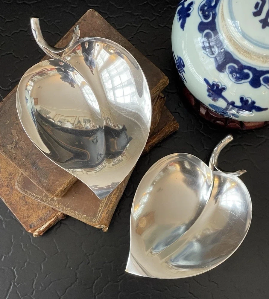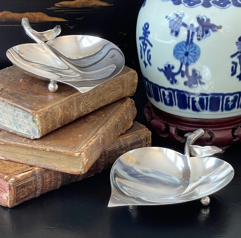 Here we have a marvelous rare example of a fully hallmarked traditional MCM American dual ball-footed sterling silver peach leaf form master bonbonniere salt caviar canapé serving dining dish vessel bowl pair #25053. This fine rare large scale 6” length, 4.35” width and 1.5” height example is manufactured and marked to verso by celebrated American maker Tiffany & Co, c1950-1960. A fine example of American MCM aesthetic, this scarce period matching two-piece master serving set is a stunning and stylish example to own and enjoy. In quality heavy gauge sterling silver, this marvelous period American heritage showpiece is sure to delight every admirer when featured on display or for use. The condition is excellent. The patina boasts a warm sterling silver luster. This scarce gallery quality item has a glorious look and feel to treasure for generations. 7.639 ozt. Endless possibilities. Display ready.