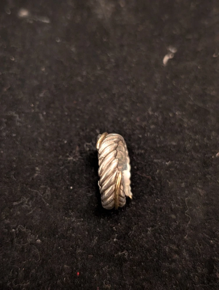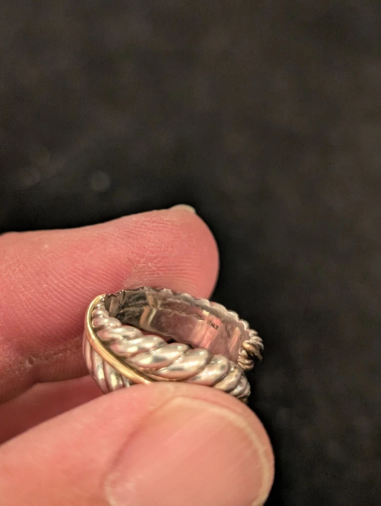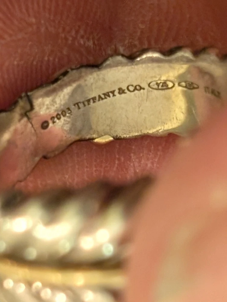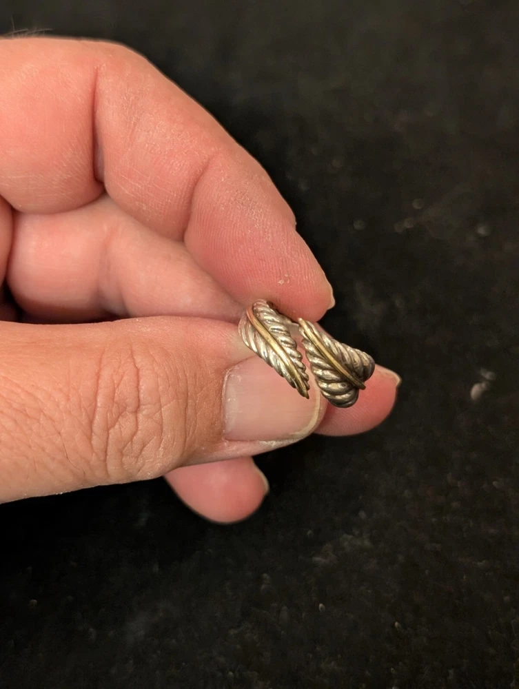 Tiffany & Co Leaf Feather Bypass Ring Sterling & 18k Gold Size 5.5 Damaged The ring has a crack in the band where someone tried to adjust the size without taking it to a professional. See pictures. No box or bag included.
