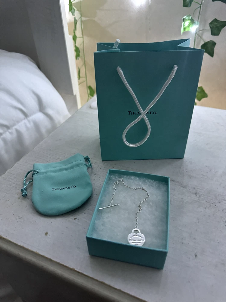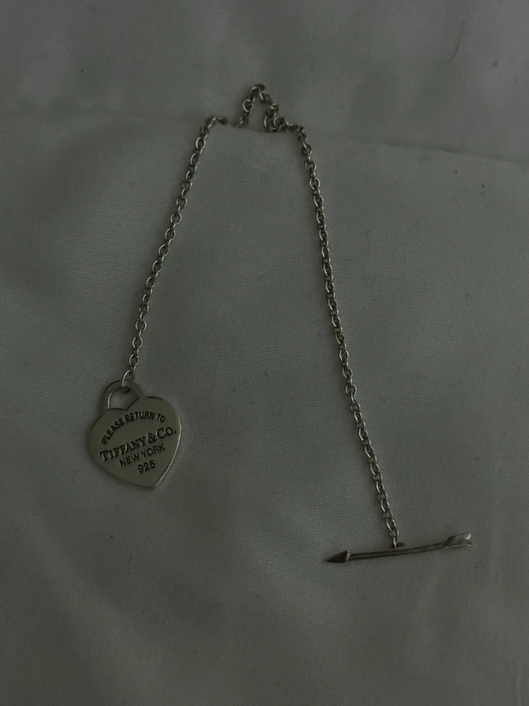 This sterling silver bracelet features a sterling silver arrow-shaped toggle closure that makes a perfect pair with the iconic heart tag. Sterling silver, size large, 7 inches long, motif size, small, toggle closure. Pre-owned but still in good condition. Comes with an original Tiffany Box and white ribbon. Original price is $285.