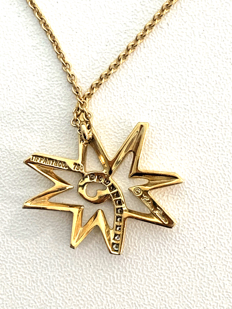 PRICE to SELL: The TIFFANY & CO. Paloma Picasso 18K Yellow Gold Diamond Star Necklace is a stunning piece of fine jewelry that features a star-shaped pendant adorned with natural diamonds. The necklace is crafted from 18K yellow gold with a braided chain, and it is signed by Tiffany & Co. This vintage piece is perfect for special occasions like Mother's Day, Christmas, anniversaries, birthdays, and Valentine's Day, making it a luxurious and timeless gift for any jewelry lover. One owner!