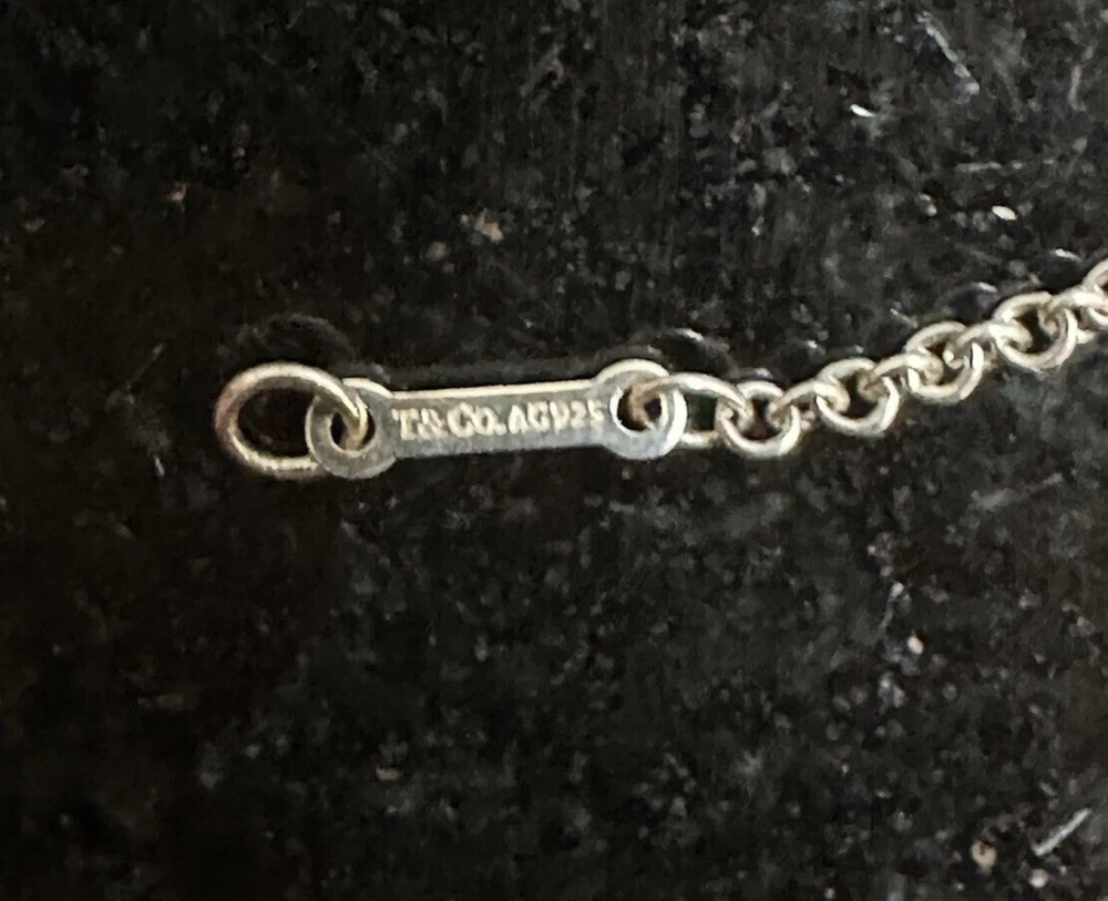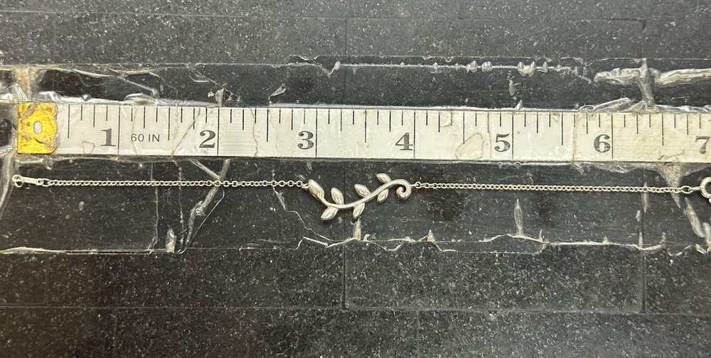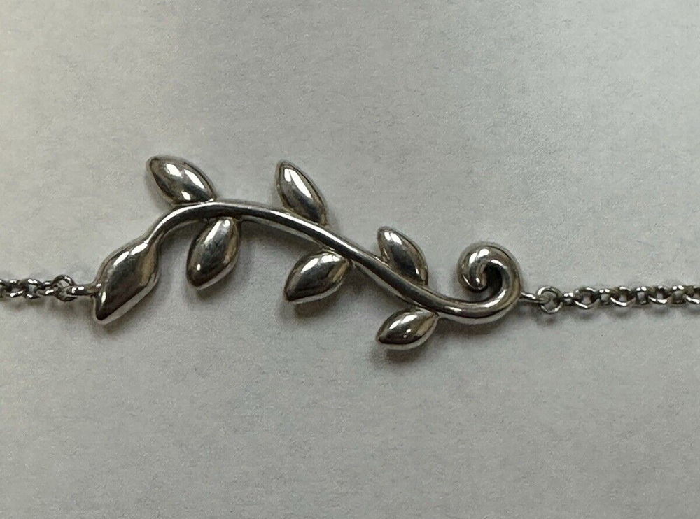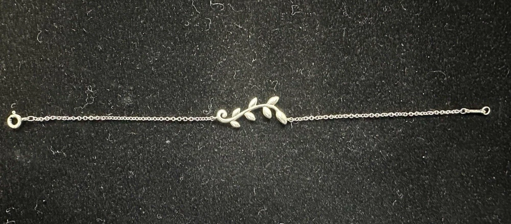 This Tiffany & Co. bracelet is from the Paloma Picasso collection, made of sterling silver with an olive vine leaf design. It measures 7 inches in length, features a spring ring closure, and is signed by the brand. DOES NOT COME WITH BOX OR PAPERS