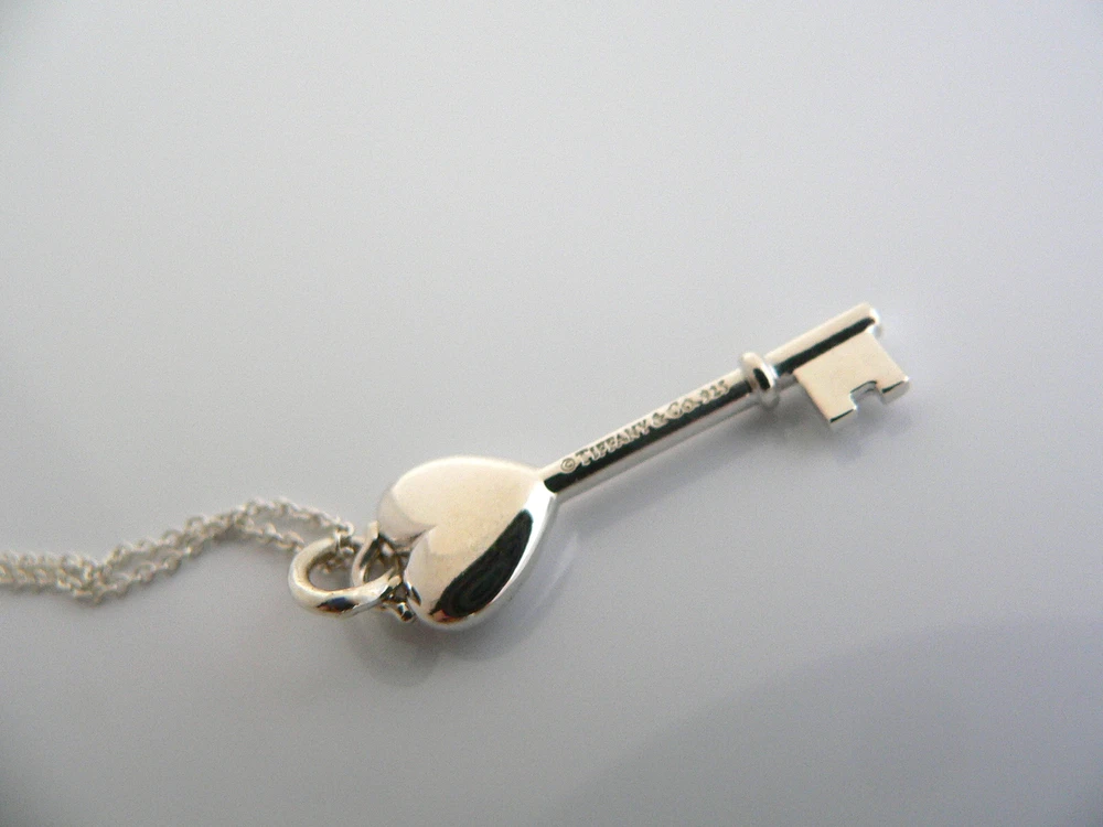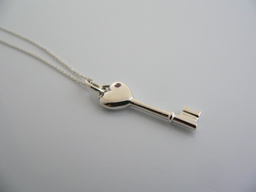 Overview: Offered for sale is a fantastic and very pretty Tiffany and Co. Sterling Silver and Pink Sapphire Heart Key Necklace. Wonderful necklace that fits a lifestyle on the go -- the necklace can be worn to almost any occasion! Hanging from its beautiful Tiffany & Co sterling silver curb chain is a very pretty Heart Key pendant with a very pretty sparkling Pink Sapphire on one side. It is simple and yet looks extremely elegant. Perfect way to say "Here's the key to my heart :)" without ever having to say a word - believe me, she will know! :) Imagine the piece with your professional office attire ... Now imagine it with jeans or weekend wear ... Perfect in every way! The item is very comfortable to wear, and is in very good condition. A classic Tiffany piece to start or add to your collection. Both key pendant and chain are fully hallmarked and guaranteed to be 100% authentic. Wonderful present for yourself or anyone you love! Will surely delight! Particulars: Size & Measurements: The key pendant is 1.25 inches (including bail). The chain is 16 inches long. Metal & Hallmarks: Tiffany & Co. / 925 (on chain and key pendant) Solid 925 sterling silver Please check out my other unique and interesting Tiffany items on sale.