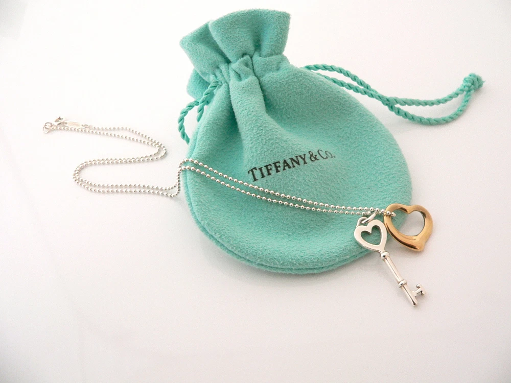 Overview: Offered for sale is a fantastic, very elegant, and super pretty Tiffany and Co. Silver Heart Key & 18K Gold Open Heart Combination Necklace. Wonderful necklace that fits a lifestyle on the go -- the necklace can be worn to almost any occasion! Hanging from its super pretty Tiffany & Co. sterling silver link chain are two gorgeous and classic Tiffany & Co Charms - A Sterling Silver Heart Key charm and an 18K Gold Peretti Open Heart pendant - awesome and versatile statement pieces! You can wear one charm at a time or combine both pendants - depending on your mood or look! It is a classic and yet extremely elegant look! And because it is two tone, the piece will complement pretty much any other piece of jewelry that you already own! Perfect way to say "Here's the key to my heart :)" without ever having to say a word - believe me, she will know! :) Imagine the piece with your professional office attire ... Now imagine it with jeans or weekend wear ... Perfect in every way! A classic Tiffany piece to start or add to your collection. Both pendants and chain are fully hallmarked and guaranteed to be 100% authentic. It will come with its Tiffany pouch as shown! Perfect and ready for gifting! Wonderful present for yourself or anyone you love! Will surely delight! Particulars: Size & Measurements: The Silver Heart key pendant is approx. 1.25 inches (including the bail). The 18K Gold Open Heart charm is 16mm at its widest ends. The bead chain is 16.25 inches long. Metal & Hallmarks: Tiffany & Co. / 750 (on 18K Gold Open Heart charm) T & Co. / 925 / Italy (on Silver Heart Key Charm) Tiffany & Co. / 925 (on bead chain) Solid 925 sterling silver Please check out my other unique and interesting Tiffany items on sale.