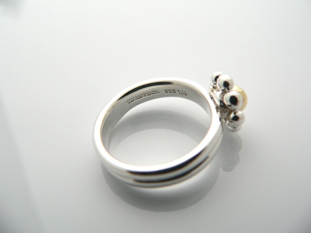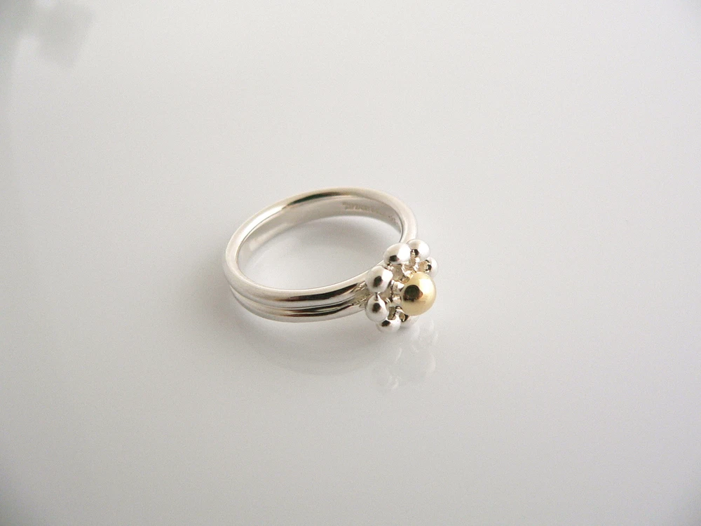 Overview: Offered for sale is a wonderful Tiffany and Co. Silver and 18K Gold Paloma Picasso Jolie Bead Flower Ring. Looks very feminine and pretty on the fingers, this ring is surely one that you will turn to over and over again. It is composed of an 18K yellow gold bead surrounded by silver beads that resemble a cute little flower. And because it is two tone, the ring will go with pretty much any other piece of jewelry you already own. It is elegant, very versatile, and extremely comfortable to wear. This wonderful piece is in very good condition. Perfect ring to start or add to your Tiffany collection. The ring is fully hallmarked and is guaranteed to be 100% authentic. Wonderful present for yourself or anyone you love! Will surely delight! Matching necklace and bangle are also available for sale in separate listings. Please have a look! Particulars: Size & Measurements: The ring is a size 6 Metal & Hallmarks: Tiffany & Co. / Paloma Picasso / 925 / 750 Solid 925 sterling silver and solid 18K gold Please check out my other unique and interesting Tiffany items on sale.