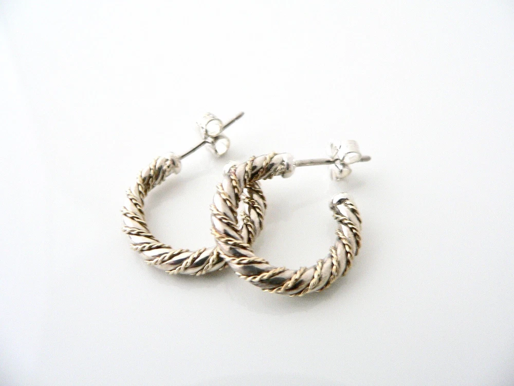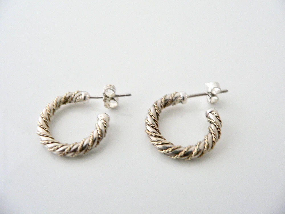 Offered for sale is a pair of Tiffany and Co. Sterling Silver 18K Gold Rope Hoop Earrings. The style is classic Tiffany, making it a piece that you will most certainly use over and over again. Great piece to wear to work, or for just going to dinner with friends in jeans or a pretty dress. Super versatile and chic piece! It's like a piece of art - right on your ears! Because the earrings are two tone, it will go well with all of your other pieces - whether it be sterling silver, white gold or yellow gold! :) Definitely a wonderful Tiffany piece to start or add to your collection. As always, the item is fully hallmarked and is guaranteed to be 100% authentic. Wonderful present for yourself or anyone you love! Will surely delight! Particulars: Size & Measurements: The earrings are approx. 0.75 inches. Metal & Hallmarks: T& Co / 925 (on earring posts) T & Co / 925 / AG (on earring backs) Solid 925 Sterling Silver and 18K Gold Please check out my other unique and interesting Tiffany items on sale.