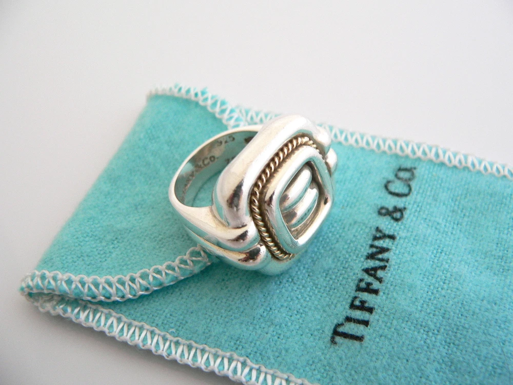 Overview: Everyone needs a signature Tiffany piece! Here is the perfect one just for you. Offered for sale is a wonderful Tiffany & Co. Sterling Silver and 18K Gold Rope Square ring. The piece is crafted from bright and substantial Tiffany silver intertwined with18K gold rope siding. Great statement piece and yet retains a feminine and delicate feel to it. Because it is two tone, it will go with pretty much any other piece of jewelry you already own! It is a wonderful ring that fits a lifestyle on the go -- can be worn to almost any occasion! It is simple, elegant, and classic all rolled into one item. Imagine the piece with your professional office attire ... Now imagine it with jeans or weekend wear ... Perfect! The ring is very comfortable to wear, and is in excellent condition. No longer in production, it is also perfect for the collector. It is THE classic Tiffany piece to start or add to your collection. As always, the ring is fully hallmarked and guaranteed to be 100% authentic. It will come with its Tiffany pouch as shown! Perfect and ready for gifting! Wonderful present for yourself or anyone you love! Will surely delight! Particulars: Size & Measurements: The ring is a size 6 Metal & Hallmarks: Tiffany & Co. / 750 / 925 Solid 925 sterling silver and 18K gold Please check out my other unique and interesting Tiffany items on sale.