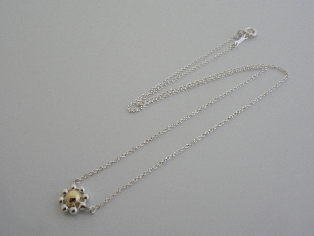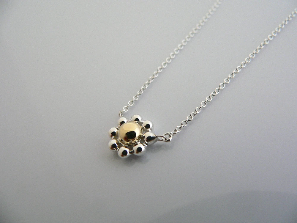 Overview: Offered for sale is a gorgeous and very rare Tiffany & Co. Picasso Gold and Silver Jolie Bead / Flower necklace. The piece is crafted from bright Tiffany silver, with a beautiful Jolie bead flower pendant. The pendant has "ears" on both sides, much like that of a diamond solitaire necklace ... only in silver / gold flower form :)). The necklace is a wonderful piece that is simple, elegant, and classic all rolled into one. It works perfectly with pretty much any attire your put on, AND adds a nice feminine touch to it. And because it is two tone, it will complement pretty much any other piece of jewelry you already own! It is a wonderful necklace that fits a lifestyle on the go -- the necklace can be worn to pretty much any occasion! Imagine the piece with your professional office attire ... Now imagine it with jeans or weekend wear ... Perfect! The item is very comfortable to wear, and is in great condition. It is a perfect Tiffany piece to start or add to your collection. As always, the item is hallmarked and guaranteed to be 100% authentic. Wonderful present for yourself or anyone you love! Will surely delight! Particulars: Size & Measurements: The chain is 17 inches from end to end. Metal & Hallmarks: T & Co. / 925 / Paloma Picasso Solid 925 sterling silver Please check out my other unique and interesting Tiffany items on sale.