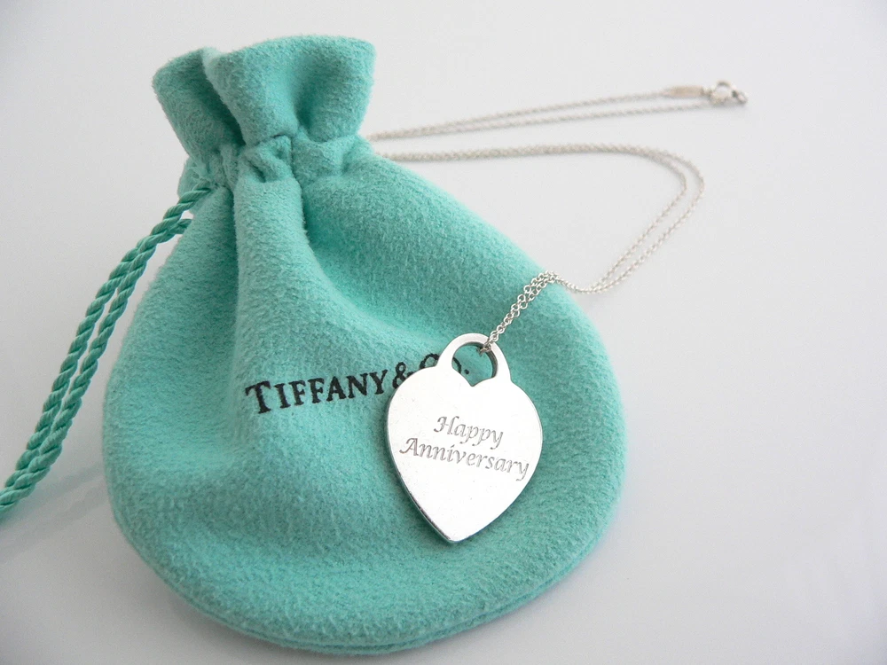 Tiffany & Co Silver Heart HAPPY ANNIVERSARY Medium Necklace Pendant Charm Chain