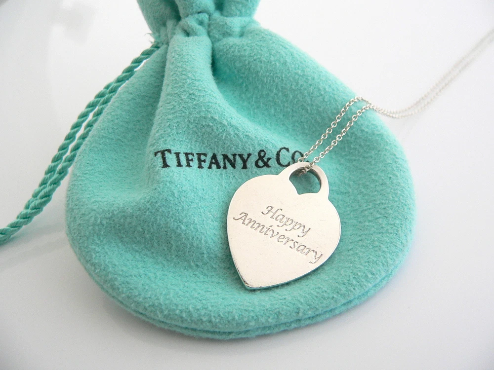 Looking for a perfect Anniversary gift? Here it is! O ffered for sale is a very pretty Tiffany & Co. Silver "Happy Anniversa ry " Heart charm necklace. Hanging from its bright Tiffany sterling silver curb chain is a wonderful heart charm with the words "Happy Anniversary" written in beautiful script form. The heart charm is currently unengraved on the back so it is ready to be personalize if you chose to do so. The necklace is simple, elegant, and classic all rolled into one item. It is a wonderful Tiffany piece to start or add to your collection. As always, the item is hallmarked and guaranteed to be 100% authentic. Particulars: The chain is 18.5 inches from end to end. The heart charm is a tad less than 0.9 inches at its widest ends. Metal & Hallmarks: Tiffany & Co. / 925 (on both the heart charm and the chain clasp) Solid 925 sterling silver Please check out my other unique and interesting Tiffany items on sale.