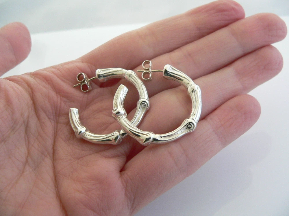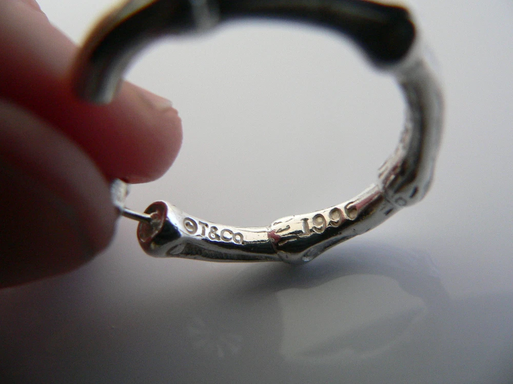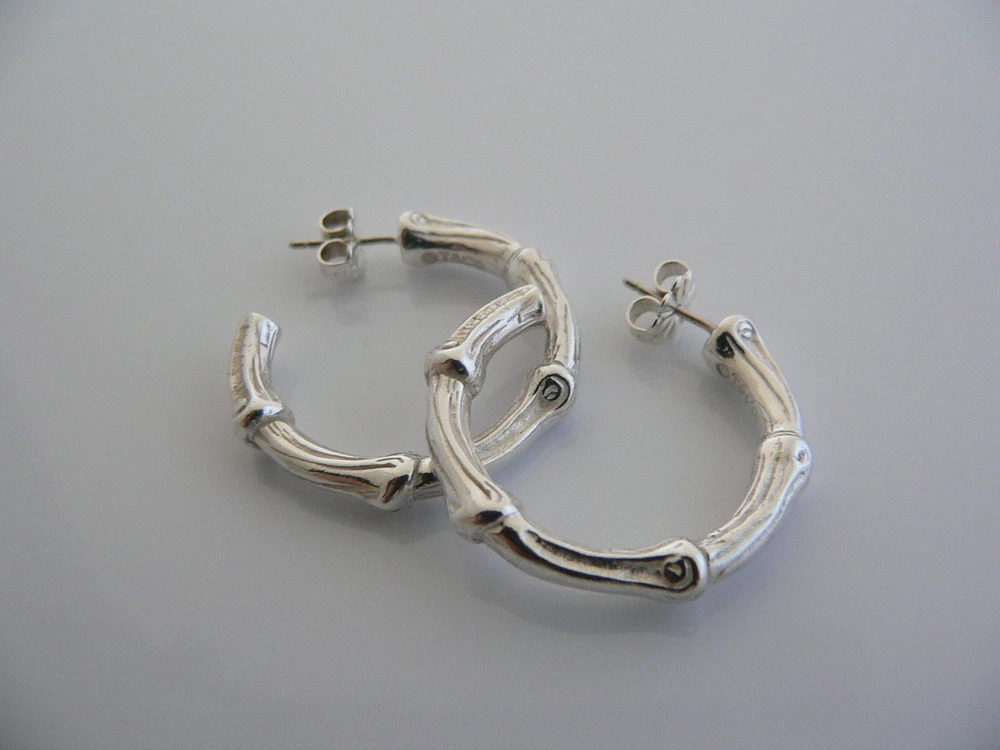 Overview: Offered for sale is a gorgeous and rare Tiffany & Co Sterling Silver Large Nature Bamboo earrings. Made from solid and bright Tiffany silver, yet maintains its delicate and feminine feel! Looks and feels wonderful on your ears. I am 100% positive that you will want to use yours over and over again as well. Your friends will be fascinated by this gorgeous piece – it is almost like a work of art! The look of the piece is simple, classic, and very elegant. The pair works with pretty much anything you put on … and adds a touch of pizazz to it! The pair is in excellent condition! A perfect and rare Tiffany piece to start or add to your collection. The earrings are fully hallmarked and guaranteed to be 100% authentic. Wonderful present for yourself or anyone you love! Will surely delight! Particulars: Size & Measurements: The earrings are approx. 1.1 inch each. Metal & Hallmarks: T & Co. / 1996 / 925 Solid 925 sterling silver Please check out my other unique and interesting Tiffany items on sale.