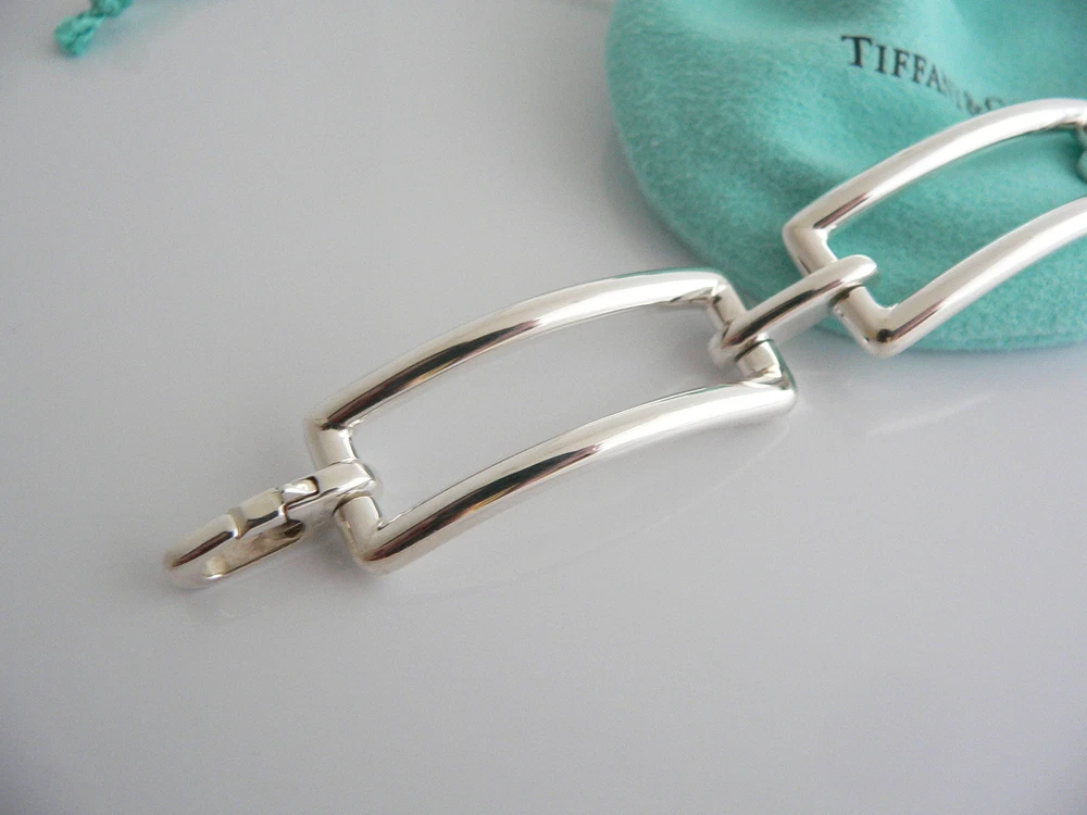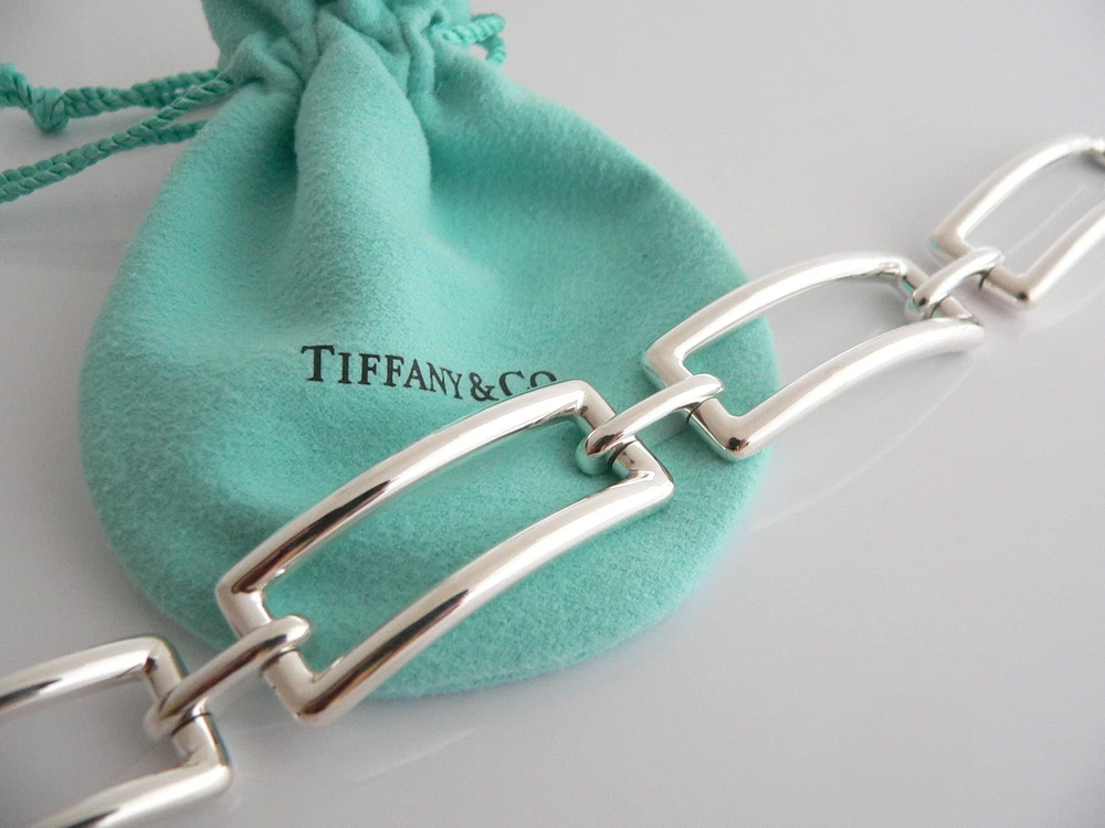 Overview: Offered for sale is a wonderful and gorgeous Tiffany & Co. Sterling Silver 7.5 inch Rectangle Link Chain bracelet. Definitely a Tiffany piece that you will get your money's value for. It works perfectly with pretty much any attire your put on, AND is a great statement piece. The Rectangular Links are not only very substantial, but also have a very cool, cosmopolitan and modern look and feel to it. It looks fabulous worn alone, or with other jewelry pieces. Very versatile piece indeed! The very cool thing about this bracelet is that the clasp links in a seamless way - it looks like a continuous rectangular link all the way around! This piece is simple, elegant, and classic all rolled into one bracelet. Imagine wearing the piece with your office attire... now imagine it with jeans or weekend wear ... Perfect anytime! It is in very good condition and is no longer in production. It is a perfect Tiffany piece to start or add to your collection. As always, the item is hallmarked and guaranteed to be 100% authentic. Wonderful present for yourself or anyone you love! Will surely delight! Particulars: Size & Measurements: The bracelet is approx. 7. 5 inches from end to end. Metal & Hallmarks: 2002 / Tiffany & Co. / 925 / Italy Solid 925 sterling silver Please check out my other unique and interesting Tiffany items on sale.