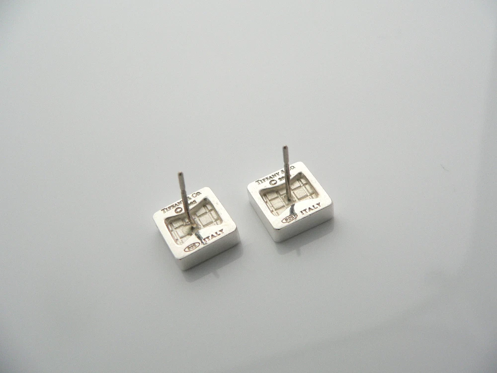 Overview: Offered for sale is a wonderful pair of Tiffany & Co. Sterling Silver Square / Diamond earrings. The earrings are very pretty, elegant, and classic all rolled into one ! Turn it one way - and they are Square Earrings ... Turn it another way - and they become Diamond Shaped Earrings! It's like a two - in - one pair! :) Works perfectly with pretty much any attire your put on, AND adds a nice feminine touch to it. It is a wonderful pair of earrings that fits a lifestyle on the go -- they can be worn to pretty much any occasion! Imagine the piece with your professional office attire ... Now imagine it with jeans or weekend wear ... Perfect! The earrings are very comfortable to wear, and are in very good condition. No longer in production, it is perfect for the collector. It is a perfect Tiffany piece to start or add to your collection. As always, the item is hallmarked and guaranteed to be 100% authentic. Wonderful present for yourself or anyone you love! Will surely delight! Particulars: Size & Measurements: The super versatile earrings are approx. 0.4 inches each. Metal & Hallmarks: 2002 / Tiffany & Co. / 925 / Italy (on earrings) Non-Tiffany Sterling Silver Flower earring back (Marked - 925) Solid 925 sterling silver Please check out my other unique and interesting Tiffany items on sale.