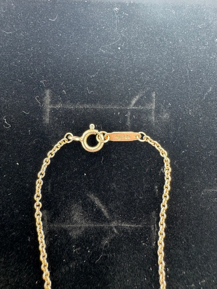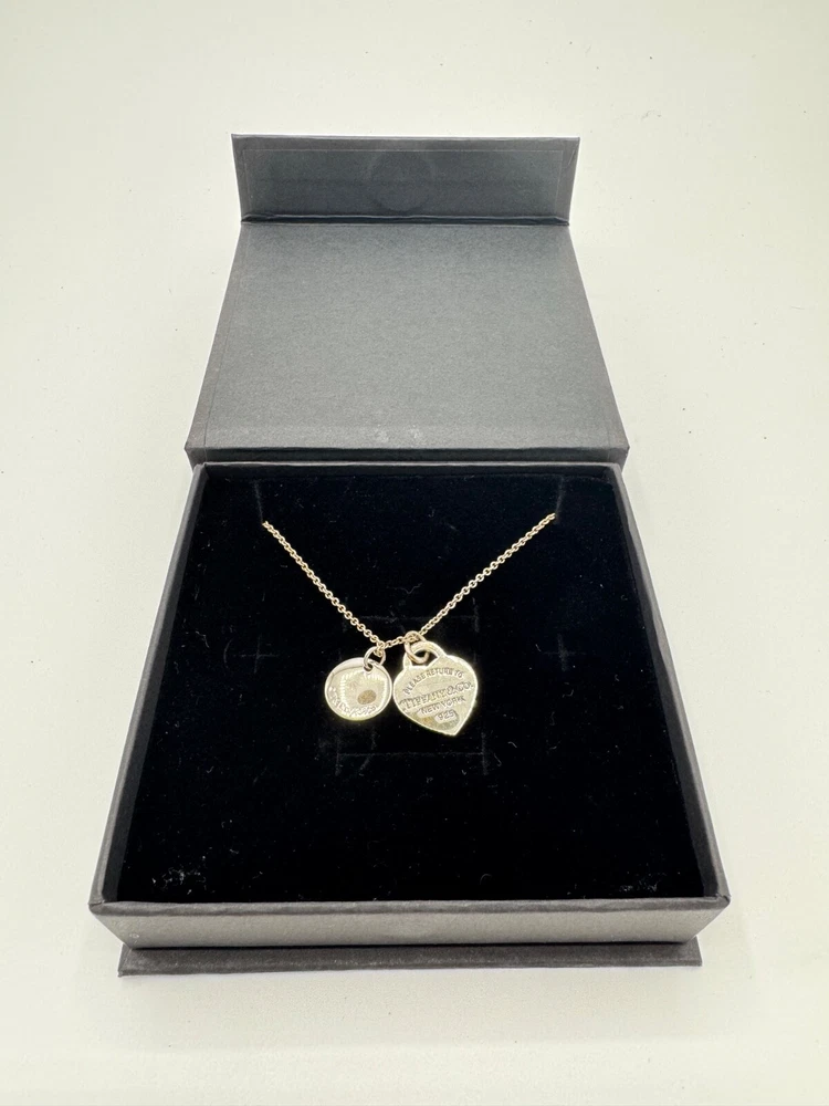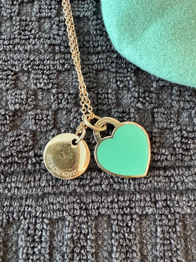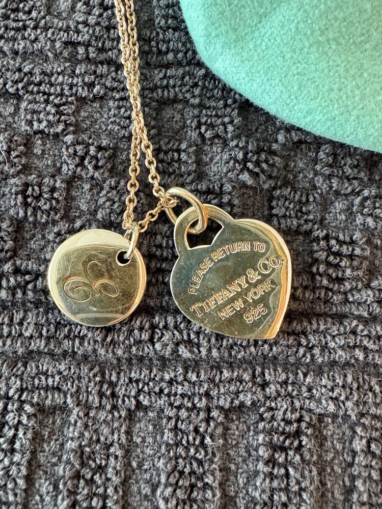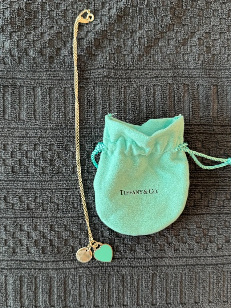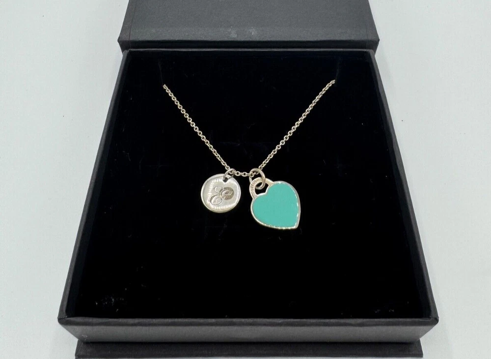 This Tiffany & Co. necklace contains their iconic heart tag with a Tiffany Blue® enamel finish and an alphabet disc charm (E) in sterling silver. The necklace is size small on a 16" chain, so it perfectly sits below your collarbone. Pendants are 5" in diameter, making it an elegant addition to everyday outfits. This Tiffany & Co. necklace is currently retailing for $450.