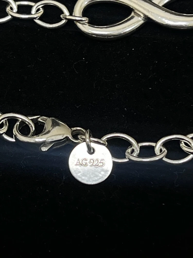 THIS IS A TIFFANY AND CO. STERLING SILVER INFINITY BRACELET. IT HAS A LARGE INFINITY CHARM IN THE MIDDLE AND ON THE OPPOSITE END, A LOBSTER CLAW CLASP WITH A CIRCULAR TAG STAMPED “TIFFANY AND CO.” AND “AG 925”. THERE IS MINIMAL WEAR TO THIS PIECE. PLEASE SEE PHOTOS BEFORE YOU PURCHASE.