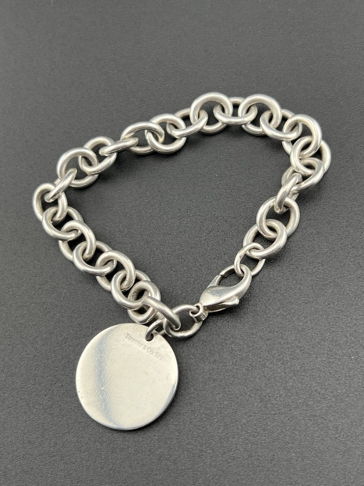 This timeless Tiffany & Co. sterling silver bracelet features a substantial round charm and classic cable link chain design. A true staple of Tiffany’s collection, this piece is perfect for everyday elegance or layered with other favorites. • Brand: Tiffany & Co. • Material: Sterling Silver (.925) • Length: Approx. 7 inches • Weight: 35 grams • Markings: “Tiffany & Co. 925” on charm and clasp • Chain Style: Cable link • Closure: Lobster clasp • Condition: Good pre-owned condition. Surface wear and light scratches consistent with age and use. Polished and ready to wear or engrave. This iconic Tiffany design is both bold and timeless. The flat tag is perfect for personalization or wearing as-is for a clean, classic look. 📦 Ships fast and securely.