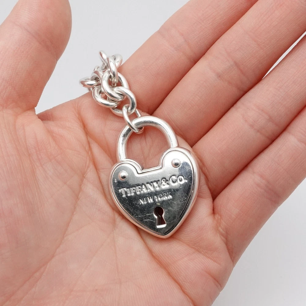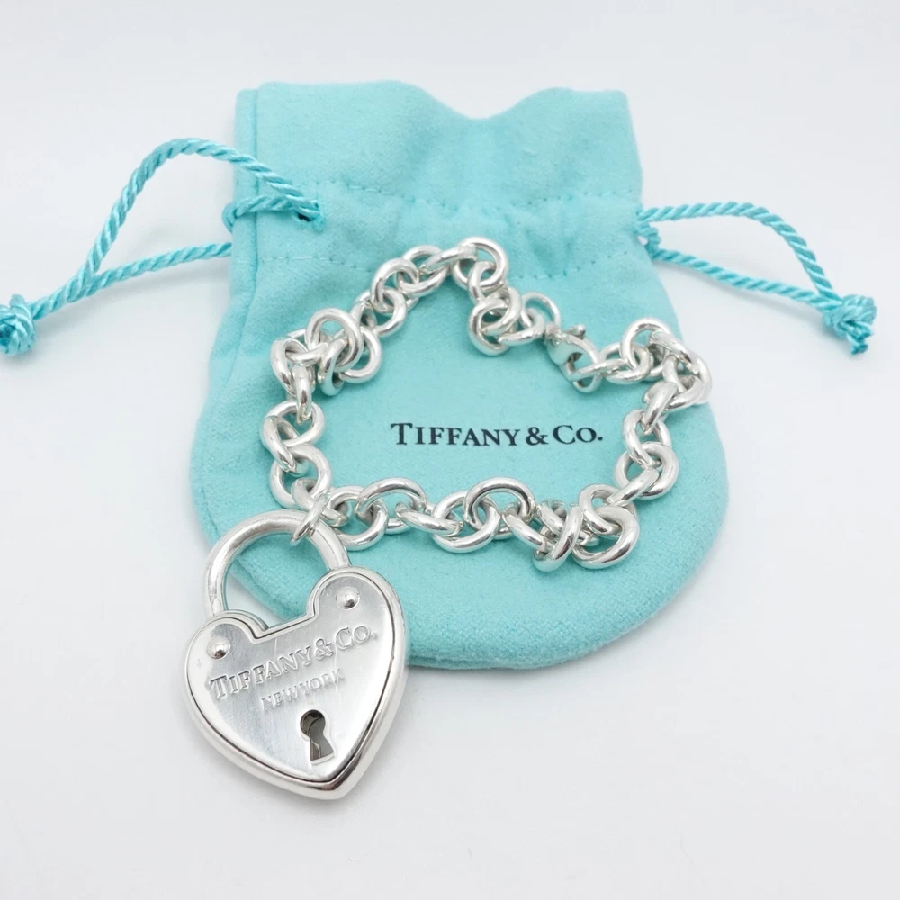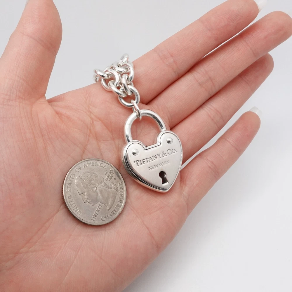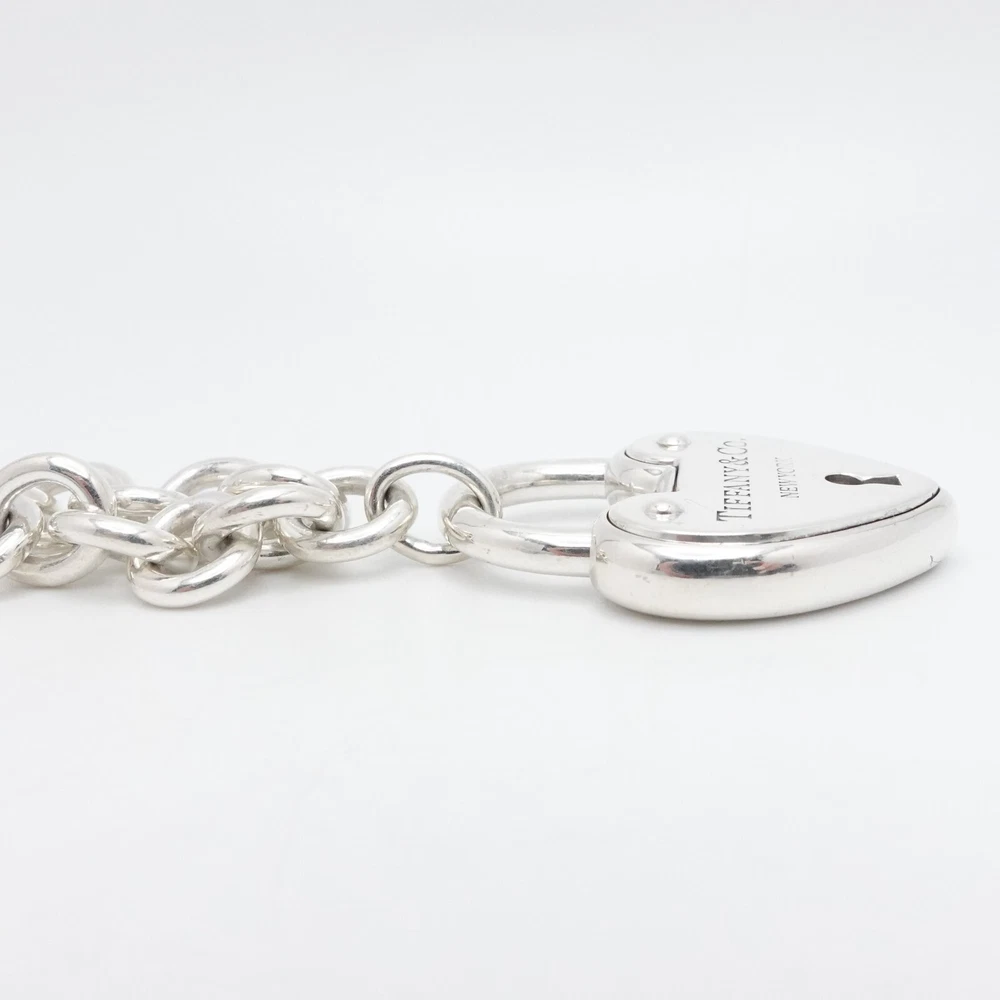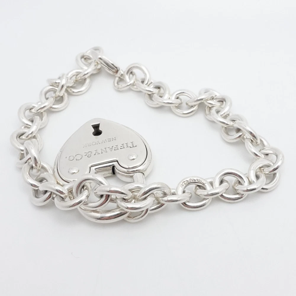 Welcome to my e B a y Store Tiffany & Co. Sterling Silver Large Heart Padlock Chain Bracelet Size - 9" Long Fits up to Relax 8" - 8.25" Snug Fit Chain Width - 8mm Charm Height - 1.33" Charm Width - 1" approx. Charm Depth - 5.5mm Thick Total Weight - 44.7 Grams Hallmark - T&Co. .925 **Padlock doe not open** Very Great & Professionally Polished Pouch Included Bid With Confidence Feel Free to ask any questions before bidding please If you would like additional pictures please send me a message Check out my other listings for more great deals! 100% Authentic or your Money Back Guarantee!! Free Shipping on All Items!